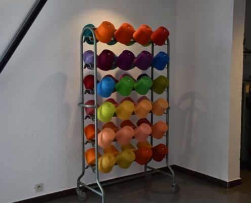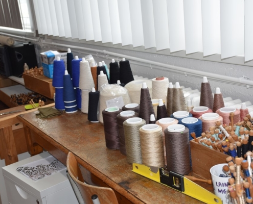 Le « labo » comporte plusieurs pièces. Il y a celle qui vous rappellera vos cours de chimie, avec des éprouvettes, des pipettes, des contenants en verre, des pieds et une hotte. Mais en face, différentes machines se côtoient. C’est là que la teinture s’opère. « On teint des bobines ou des échevettes, en laine ou en soie, pour l’atelier ou pour des clients externes », poursuit Delphine. « Que les appareils soient manuels ou plus modernes, il y a une montée douce en température jusque 98°, pendant un peu plus de deux heures, puis une redescente lente elle aussi, pour ne pas feutrer la laine. Il faut faire pénétrer la teinte au cœur de la fibre mais sans l’abîmer. » Après un essorage qui permettra d’éliminer un maximum de liquide, il faudra encore une étape de séchage à 50° pendant 24 heures.