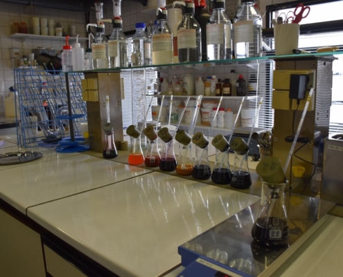 Un gros atout à Tournai : le laboratoire interne. « La teinture se fait ici. Avant, les colorants étaient d’origine végétale et animale mais maintenant, tout est chimique, pour des raisons de stabilité et de reproductibilité. Les produits doivent être stables car les normes sont très strictes. Mais on commence à faire des recherches sur des colorants végétaux durables dans le temps. »