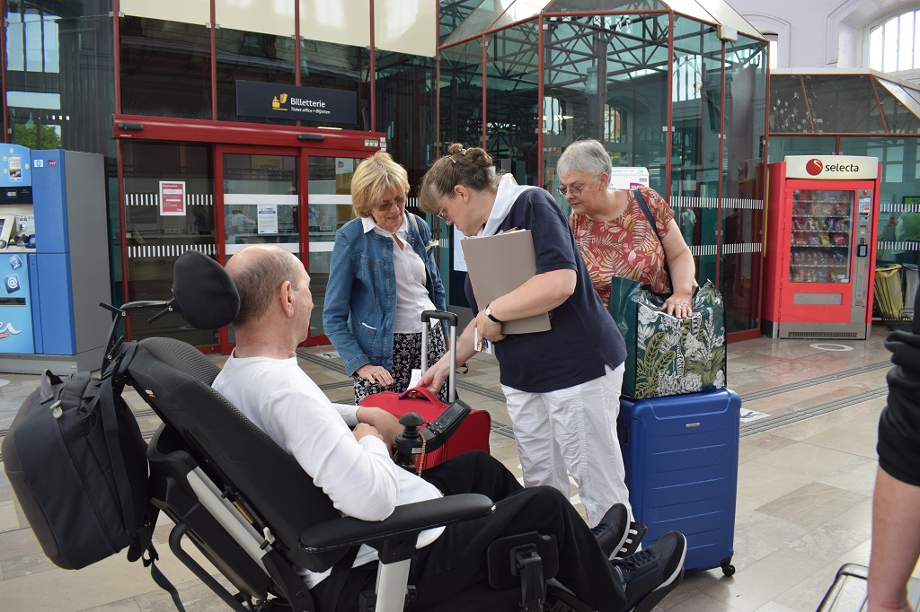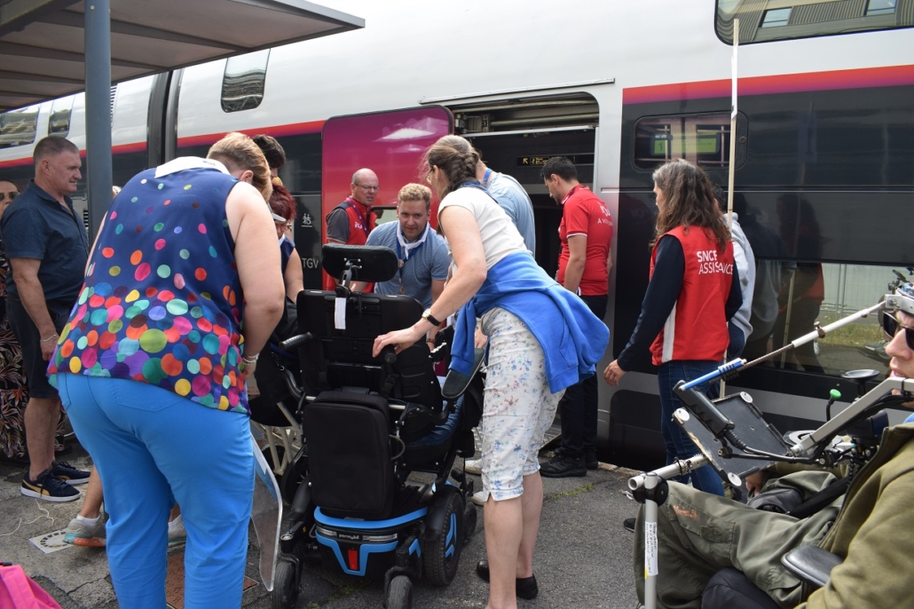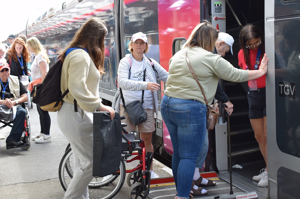 La plupart des non-valides doivent laisser leur chaise roulante ou leur voiturette sur le quai et s’installer à leur place à l’aide des brancardiers, car elles ne peuvent entrer dans les voitures. Elles les rejoindront à Lourdes. ..en camion!