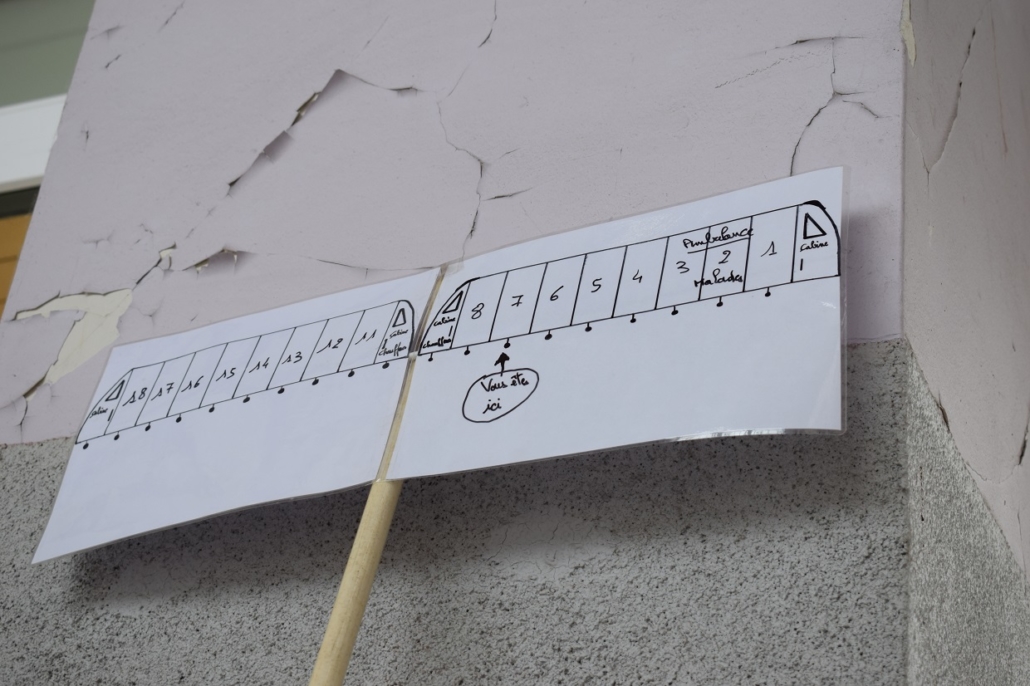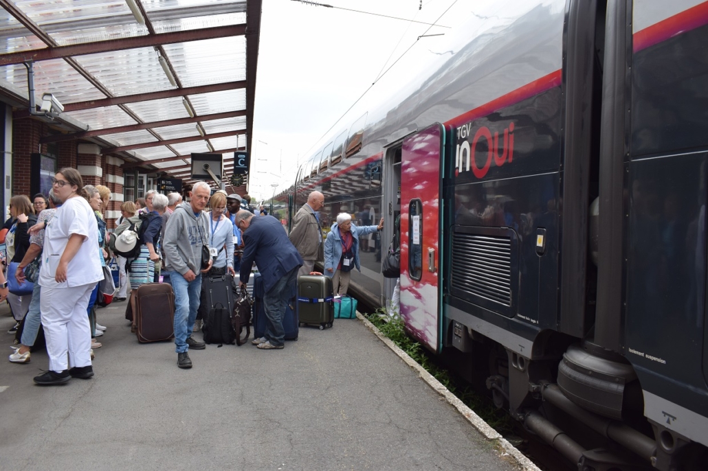 9h55. Le TGV s’arrête sur le quai. Le chargement du matériel va pouvoir commencer. Il faut aussi numéroter les différentes voitures pour aider les pèlerins à retrouver leur place. Heureusement, le temps est clément et les températures agréables, cela facilite le travail.
