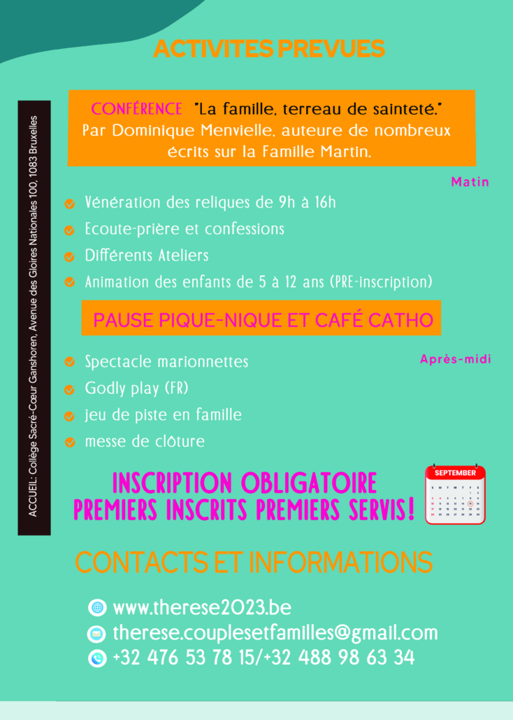 Les familles et les jeunes ne sont pas oubliés. En particulier, nous aimerions insister sur la journée des familles qui aura lieu le samedi 30 septembre 2023. Vous êtes attendus à 9h (l’accueil se fera dans le collège du Sacré Coeur en face de la Basilique). La matinée les enfants seront pris à part, l’après-midi les activités se feront en familles. La journée se clôturera par la messe de 16h. Chaque famille amène son pique-nique.
