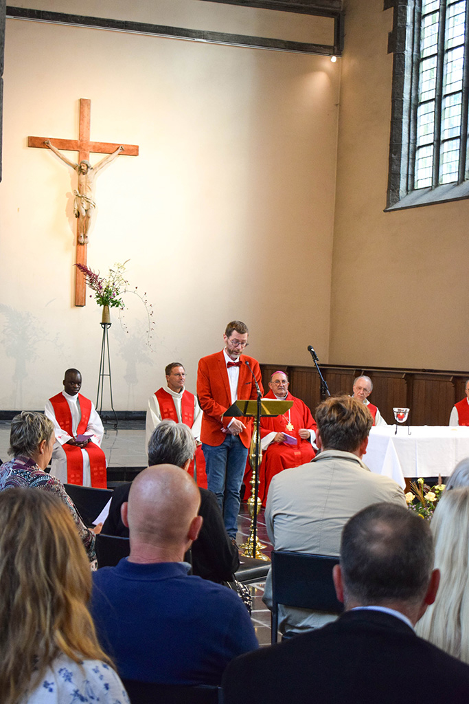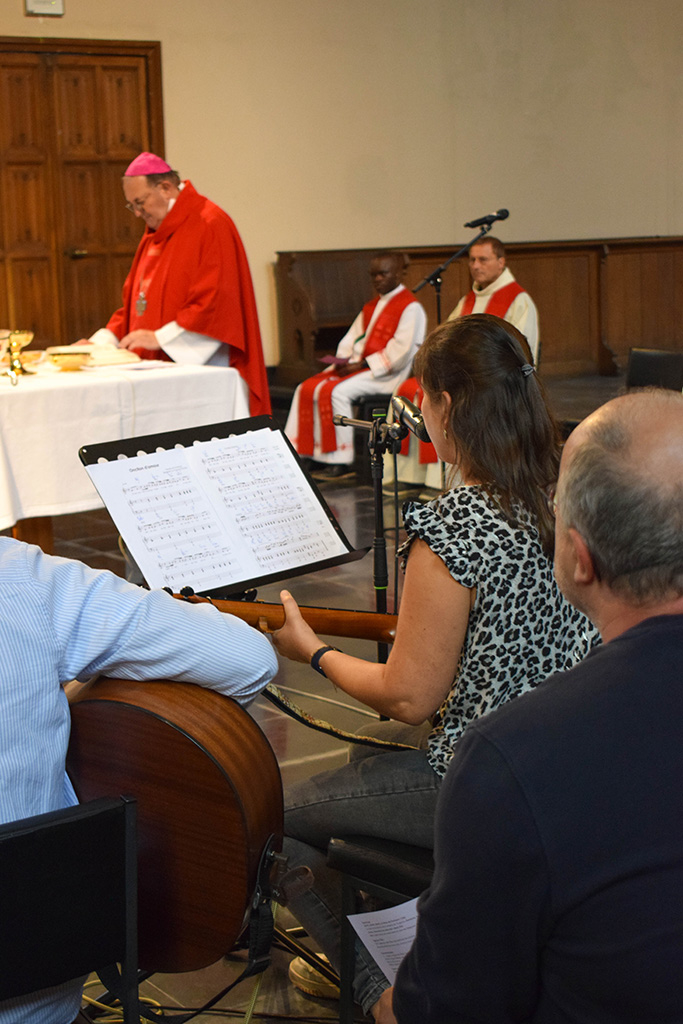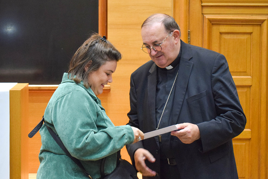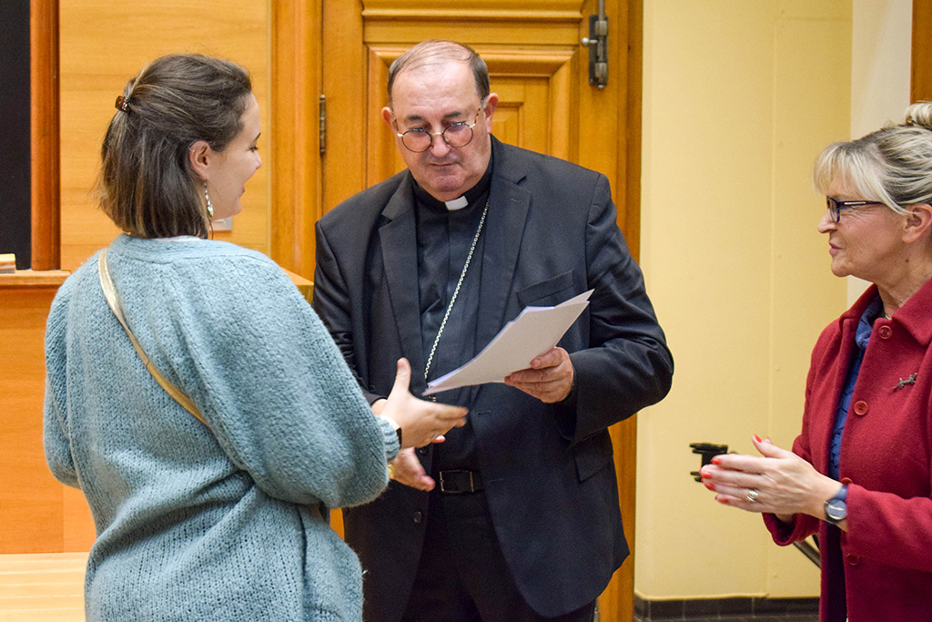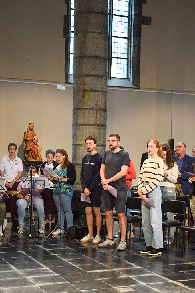La soirée commençait à 18h30 avec une Eucharistie du Saint-Esprit présidée par Mgr Harpigny. Notre évêque s’est dit étonné par le nombre d’étudiants présents, plus nombreux que ce qu’il aurait pu imaginer, d’autant plus pour un mercredi soir de beau temps. C’est vrai que la quasi-totalité des chaises prévues étaient occupées !