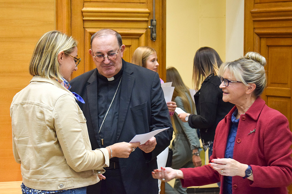 Pour conclure son mot d’accueil, le chanoine Patrick Willocq a adressé un conseil à son public : l’importance de ne jamais oublier les deux priorités de toute la vie d’un enseignant. La première, celle de faire goûter aux élèves toute l’intelligence de la foi chrétienne et les aider à découvrir et à les faire aimer le Dieu de Jésus-Christ. La seconde, les élèves qui sont confiés, leur joie de découvrir et d’apprendre les contenus de la foi chrétienne afin qu’ils puissent, dans le respect de leur liberté, en faire peut-être un choix de vie.