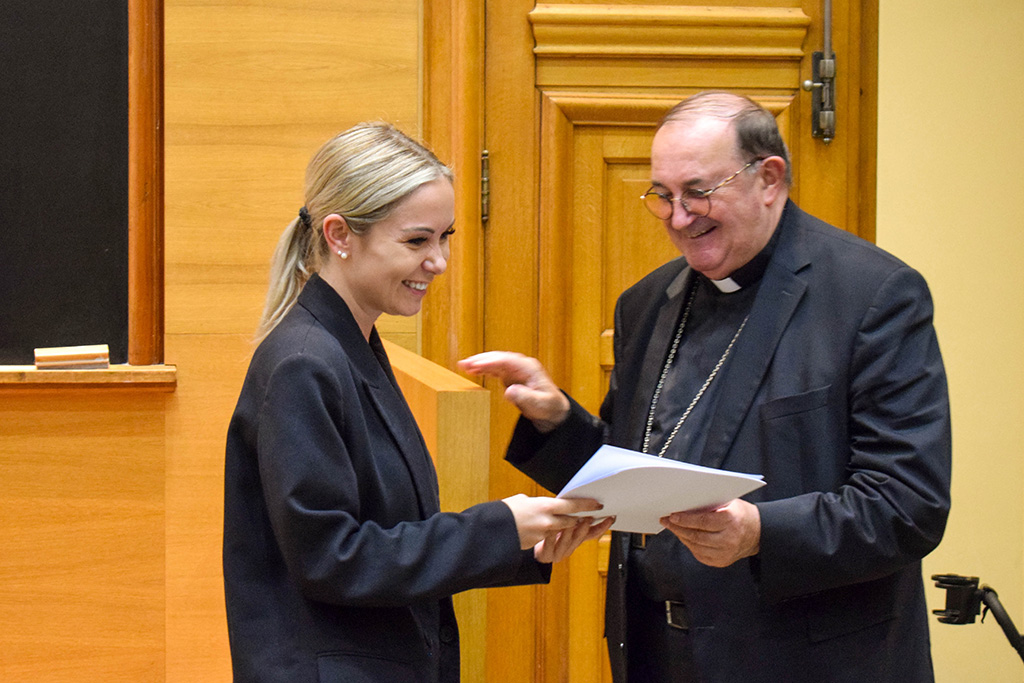 C’est le chanoine Patrick Willocq, directeur de l’I.S.T.D.T, qui a introduit cette deuxième partie de soirée. Tout comme Mgr Harpigny lors de l’Eucharistie, il a évoqué l’avenir du cours de religion : « S’engager dans le CDER ou la Formation complémentaire en vue d’enseigner le cours de Religion, c’est un pari sur l’avenir même du cours, mais un pari qui montre par lui-même que des jeunes de notre temps veulent encore prendre ce risque et se préparent avec rigueur pour être prêts à assurer ce cours ».