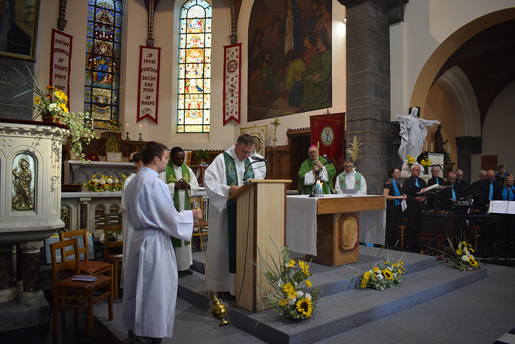La communauté paroissiale s’était réunie avec la chorale de Sivry pour célébrer dignement cet anniversaire. Mgr Harpigny s’est réjoui d’entendre la chorale chanter de « la musique plus moderne ». La couleur jaune des tournesols, couleur de la joie, illuminait l’église. Les tournesols aux pieds de l’autel invitaient les fidèles à se tourner vers Dieu comme les tournesols se tournent vers la lumière.