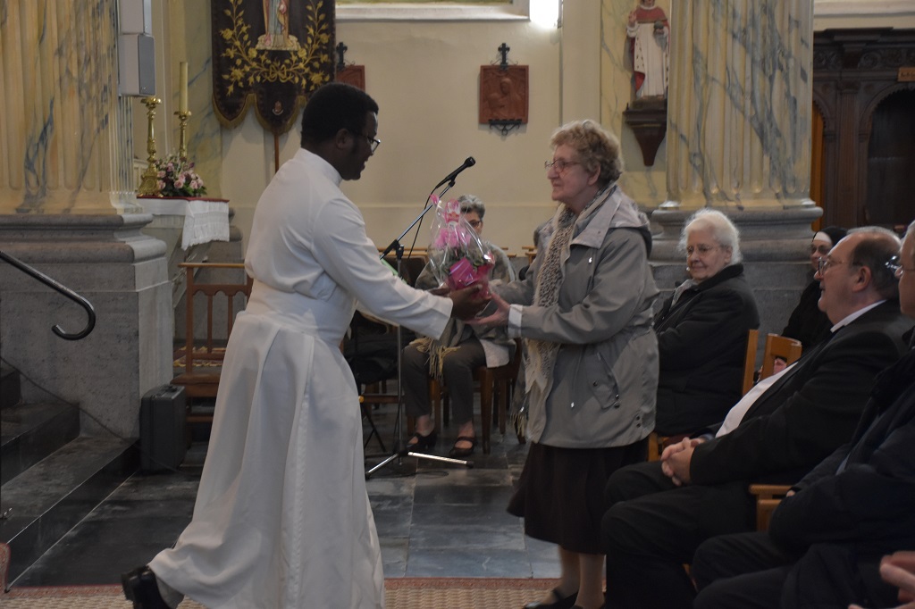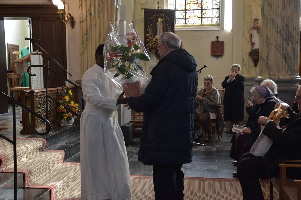 Après cet exposé, l’assemblée a été invitée à interroger Mgr Harpigny. Est venu ensuite le temps des fleurs. Mgr Harpigny a reçu des fleurs mais aussi un bel album photo en cadeau. M. l’abbé Vinckier, responsable du service de la Vie consacrée, a également été fleuri, tout comme les jubilaires de l’année. Notons que la doyenne des jubilaires fêtait pas moins de 75 ans d’ordination !