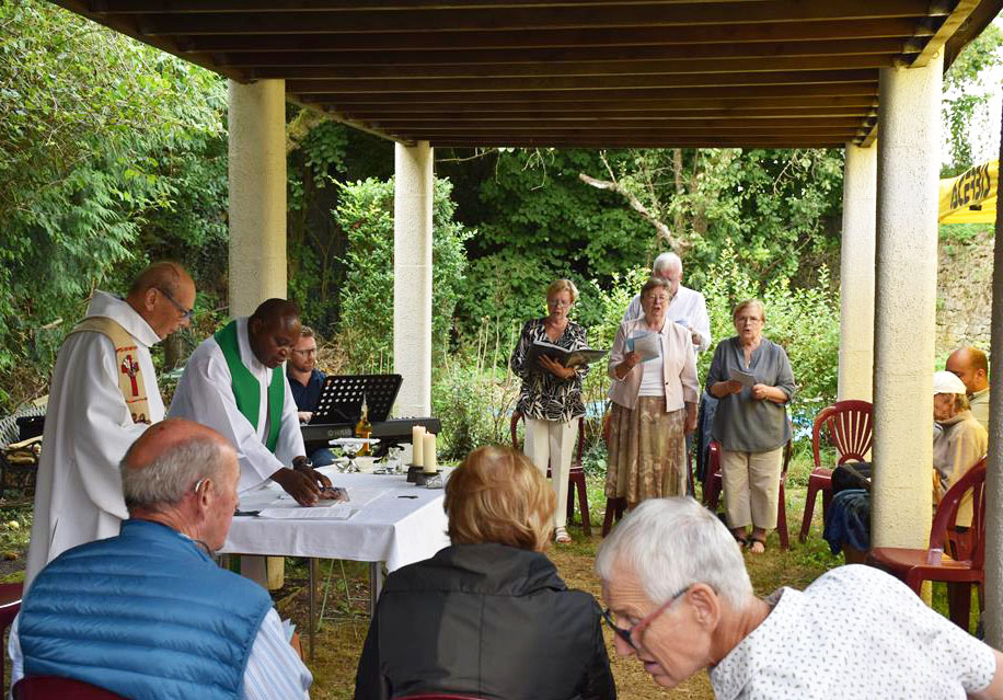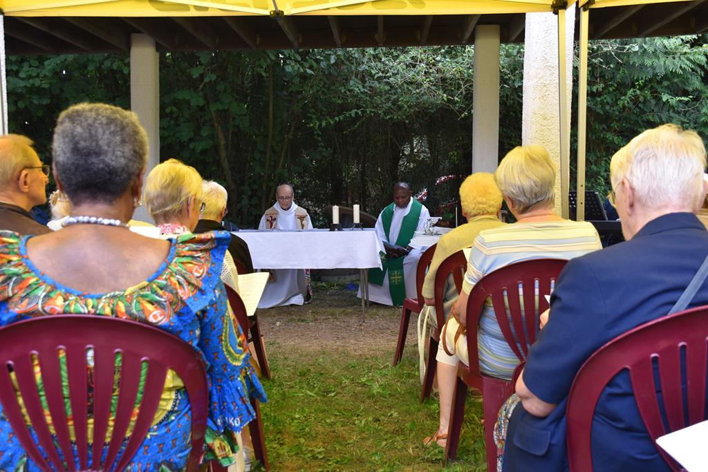 Une partie des personnes présentes a ensuite pu vivre l’eucharistie dans le jardin de la maison des martyrs. L’abbé Étienne Mayence avait 6 ans quand son papa a été abattu dans cette rue du grand Charleroi. Aux côtés de l’abbé Thaddée Kumakinga, responsable de l’unité pastorale de Courcelles, c’est avec beaucoup de simplicité et d’émotion qu’il célèbre la messe.