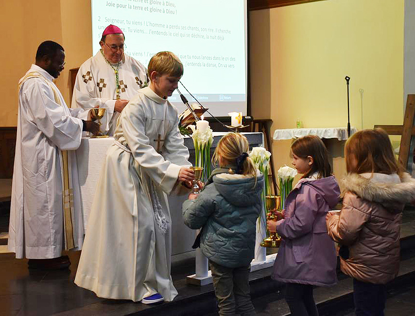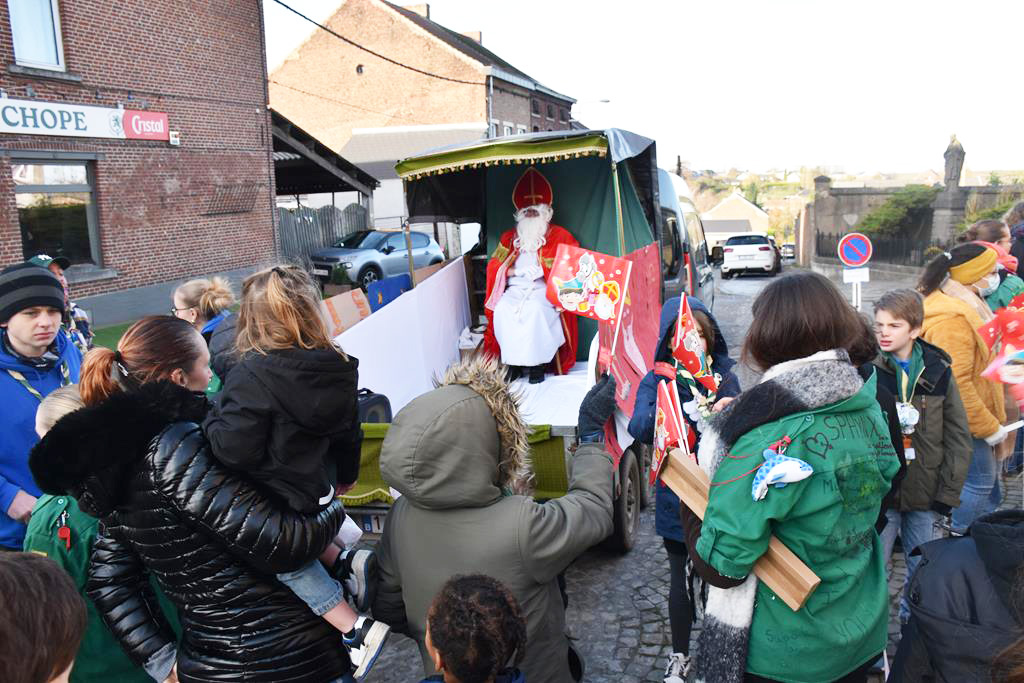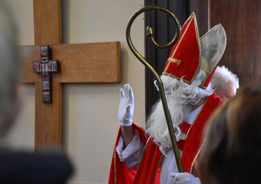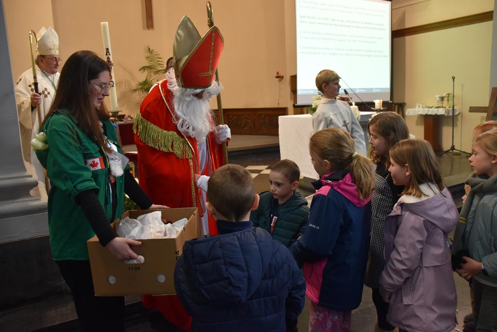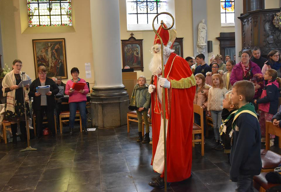 Alors que la célébration se termine, la présidente de la Fabrique d’église, Marie-Ève Bury, remet un petit cadeau à Mgr Harpigny. Elle prend aussi le micro pour remercier toutes celles et tous ceux qui ont permis la réussite de ce bel anniversaire. Mais elle est interrompue par un appel urgent et s’excuse de devoir décrocher, c’est important: «Allo, saint Nicolas?… Où sont les enfants? Oui, ils sont dans l’église… Vous arrivez? D’accord, à tout de suite.» Tout de rouge vêtu et la barbe un peu en bataille, le grand saint est venu voler la vedette à l’évêque de Tournai, non sans avoir échangé quelques mots avec lui. Tous les enfants présents ont été récompensés avec des bonbons pour avoir chanté à tue-tête en l’honneur de leur invité-surprise.