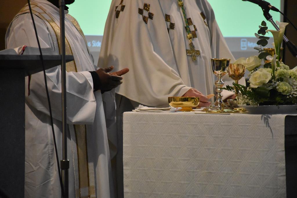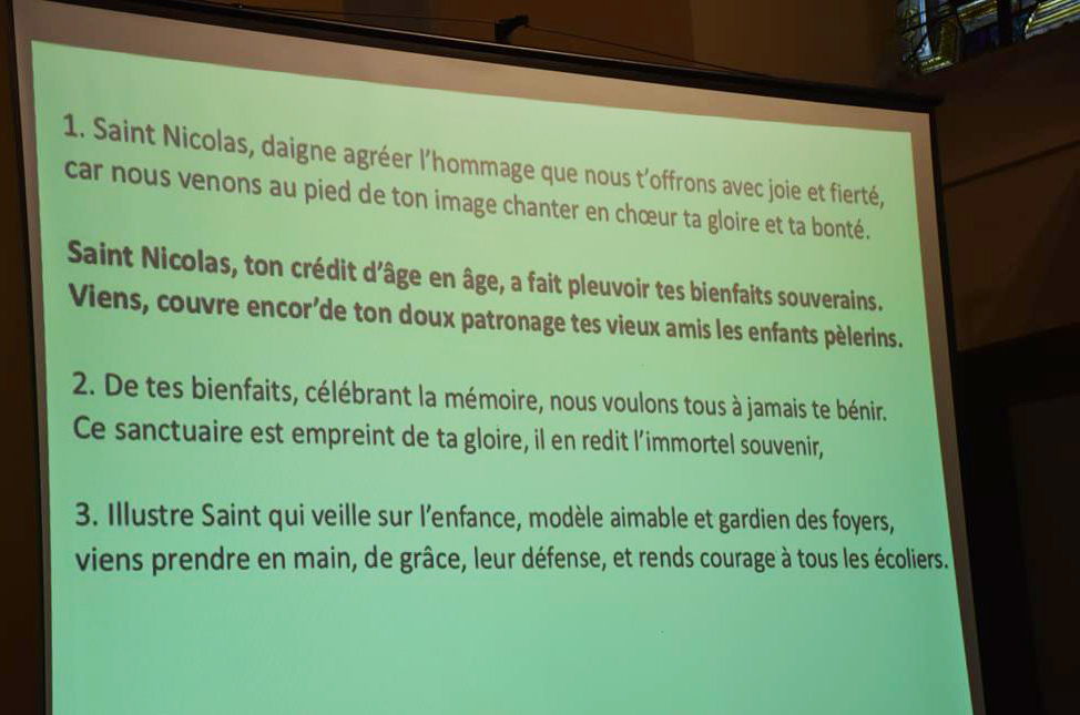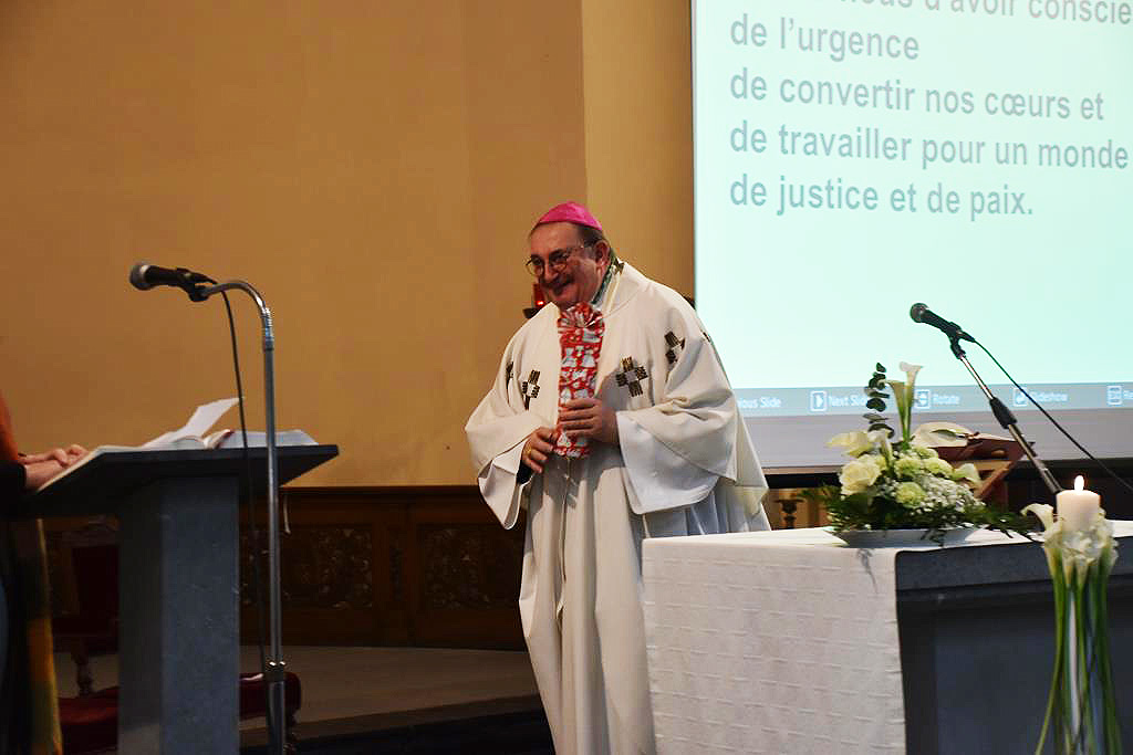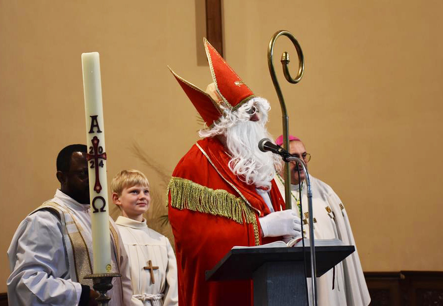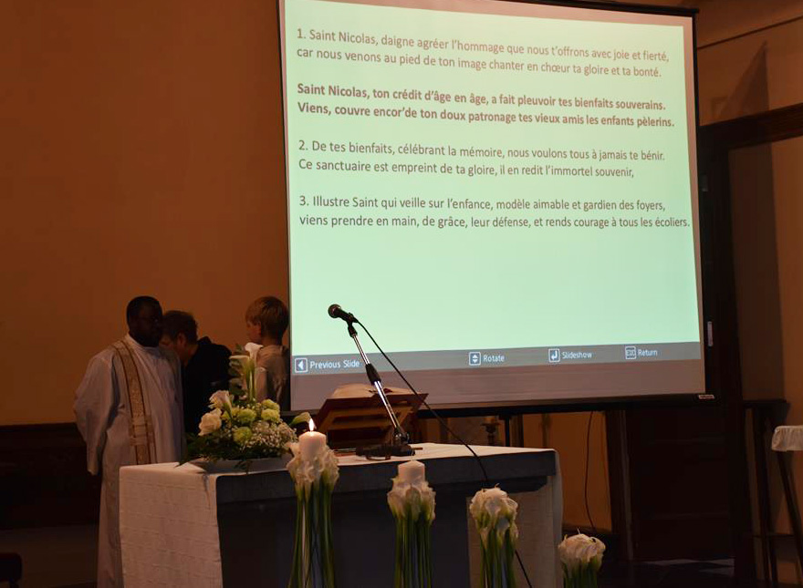 Alors que la célébration se termine, la présidente de la Fabrique d’église, Marie-Ève Bury, remet un petit cadeau à Mgr Harpigny. Elle prend aussi le micro pour remercier toutes celles et tous ceux qui ont permis la réussite de ce bel anniversaire. Mais elle est interrompue par un appel urgent et s’excuse de devoir décrocher, c’est important: «Allo, saint Nicolas?… Où sont les enfants? Oui, ils sont dans l’église… Vous arrivez? D’accord, à tout de suite.» Tout de rouge vêtu et la barbe un peu en bataille, le grand saint est venu voler la vedette à l’évêque de Tournai, non sans avoir échangé quelques mots avec lui. Tous les enfants présents ont été récompensés avec des bonbons pour avoir chanté à tue-tête en l’honneur de leur invité-surprise.