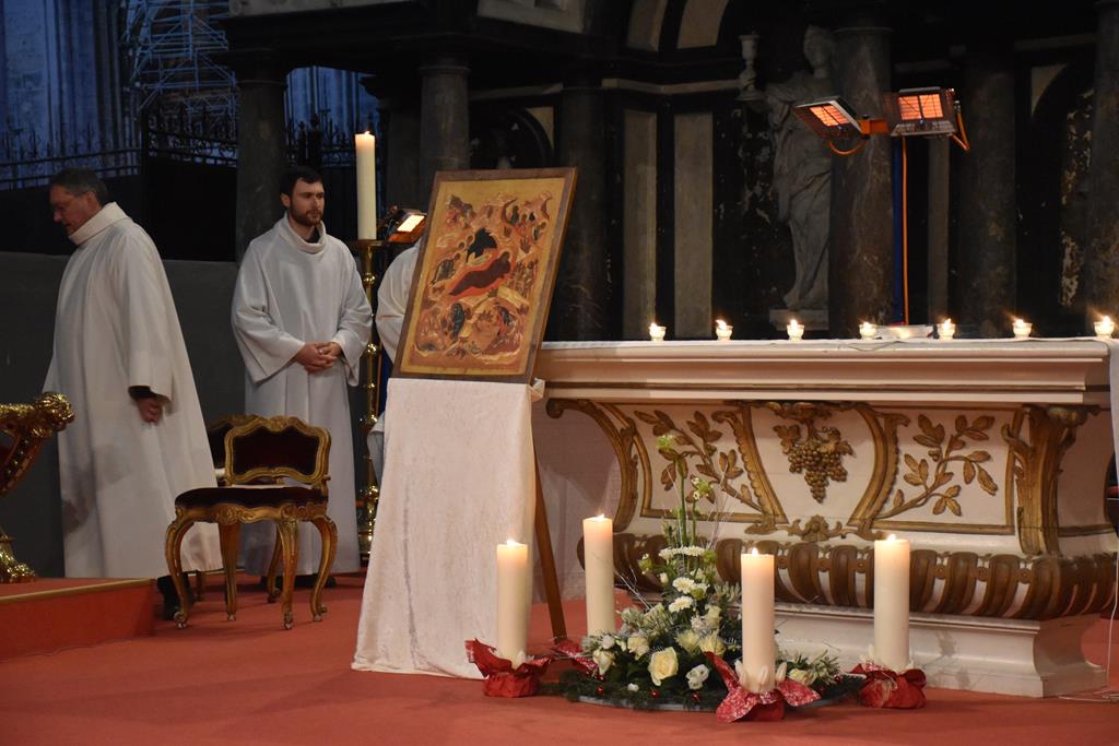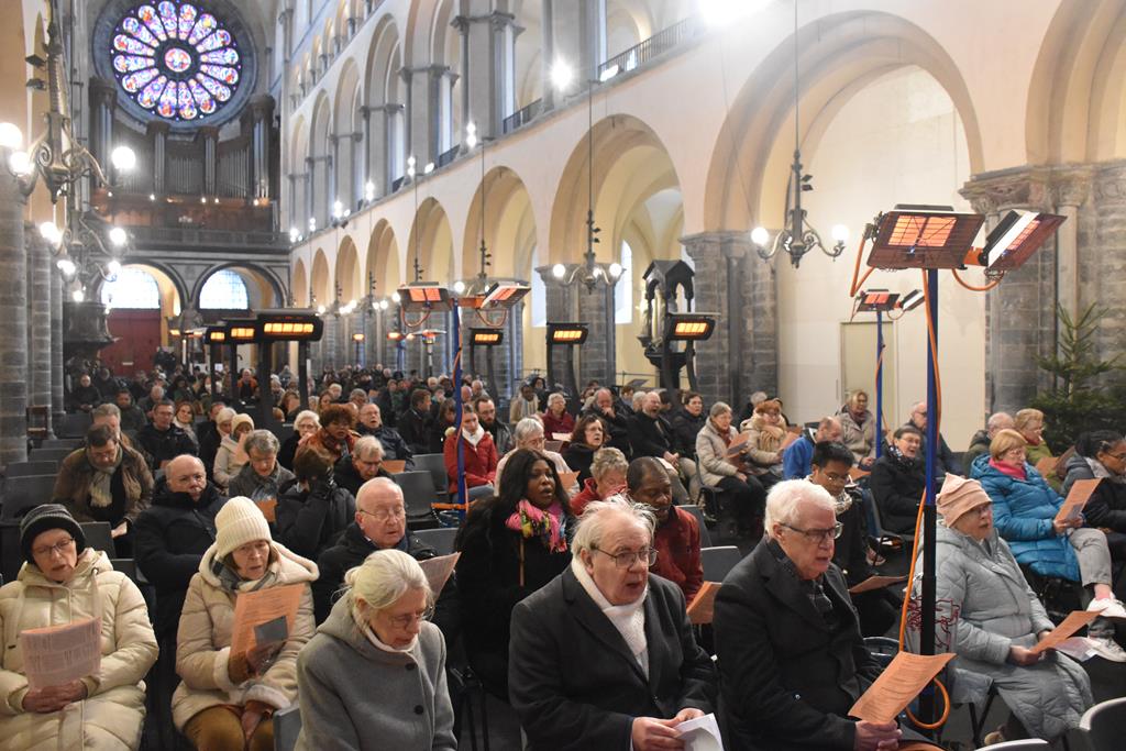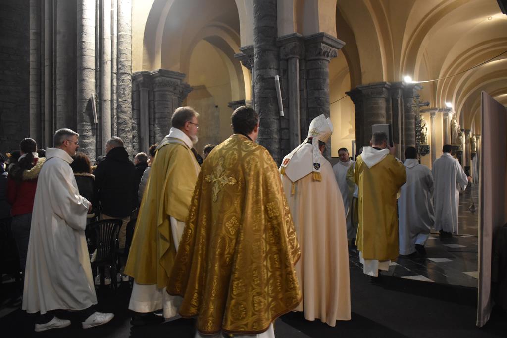 Le temps en Belgique étant comme toujours imprévisible, c’est sous la pluie que les fidèles avaient gagné l’église Saint-Quentin de Tournai ce matin du dimanche de l’Épiphanie… pour immédiatement faire demi-tour et rejoindre la Cathédrale, les intempéries ayant obligé l’annulation du pèlerinage prévu depuis cette église. Heureusement, un plan B a été trouvé et c’est finalement dans le bras droit du transept qu’ils se sont réunis pour vivre la collectio (ou « rassemblement ») du Peuple de Dieu.