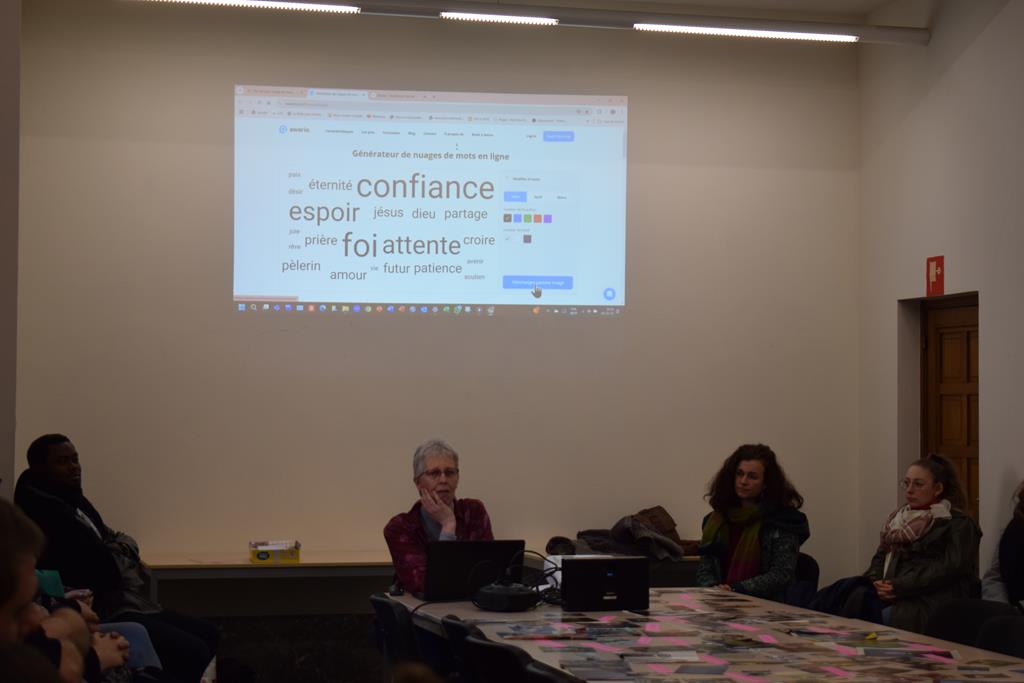 Dans le second atelier, les participants ont échangé sur le thème de l’espérance. Chacun a pu associer un ou plusieurs mots à ce thème, et le résultat a été enregistré pour générer un nuage de mots qui ont nourri les échanges qui ont suivi. Ils ont également pu choisir sur une table une phrase et/ou une image qui leur parlait particulièrement et leur inspirait de l’espérance.