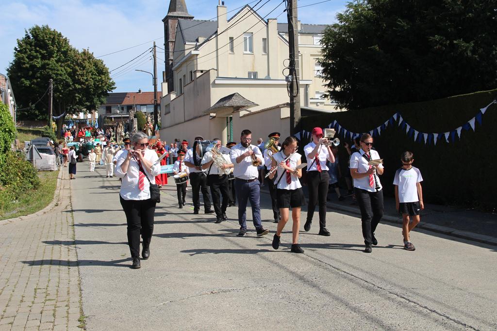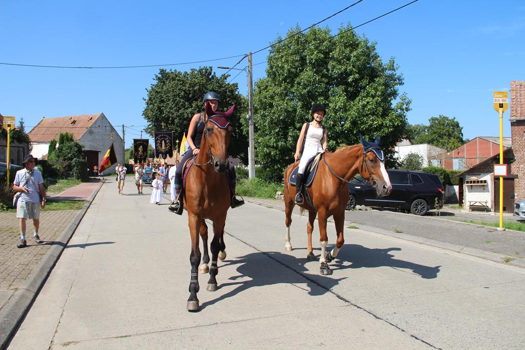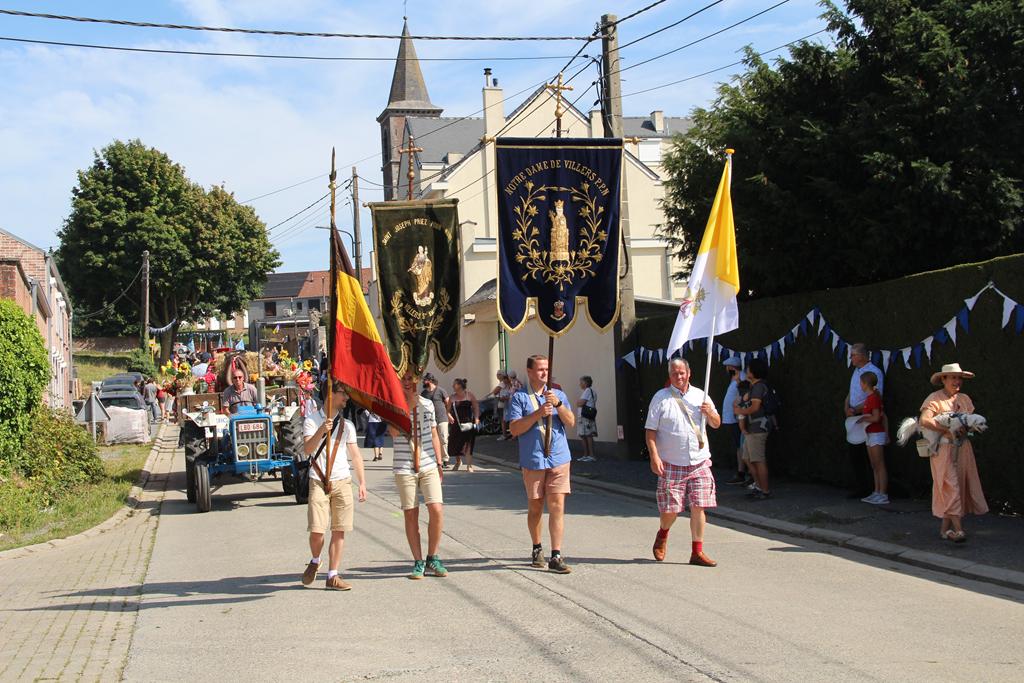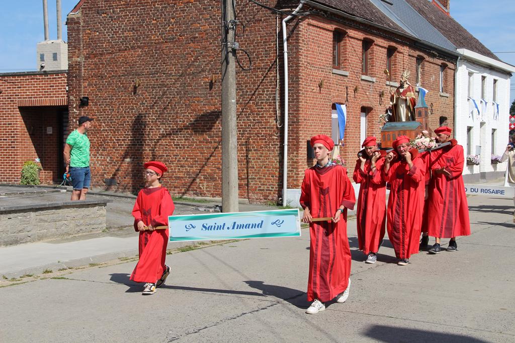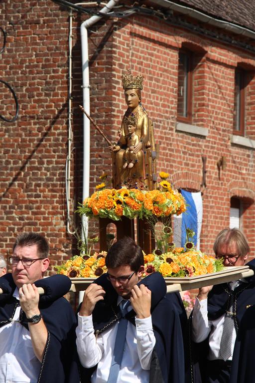À la suite d’une Eucharistie festive, la procession se mit en route pour se rendre au Sanctuaire de Villers-Notre-Dame : les cavaliers, la croix de procession et les drapeaux, le char de remerciement pour les fruits de la terre et la Fanfare Royale les Amis réunis d’Ellezelles. Vinrent ensuite les statues qui attendaient avec impatience leur sortie annuelle : Saint-Amand, Notre-Dame du Rosaire et Notre-Dame à Cailloux.