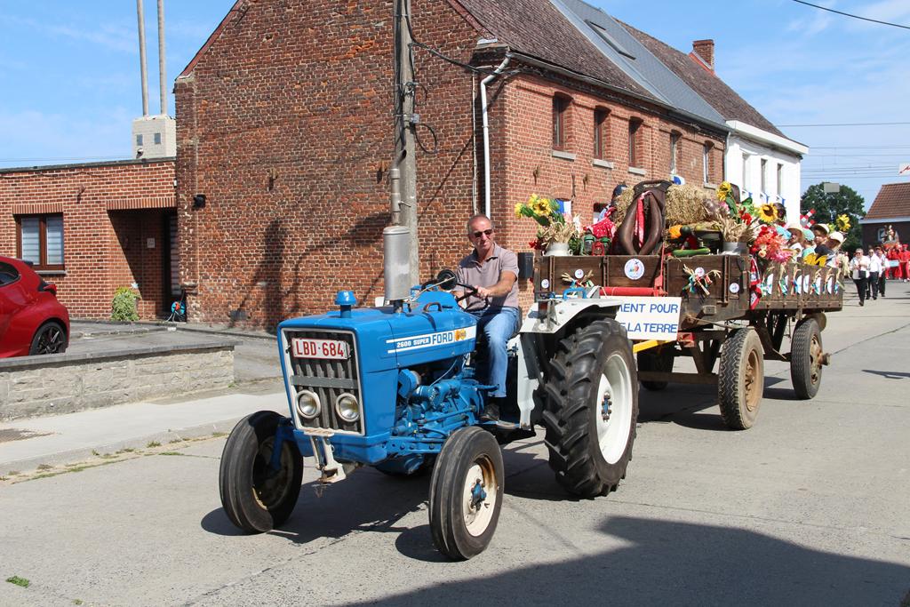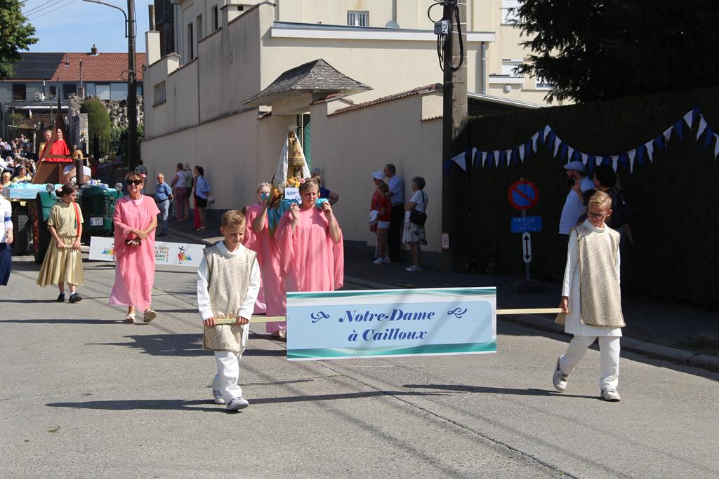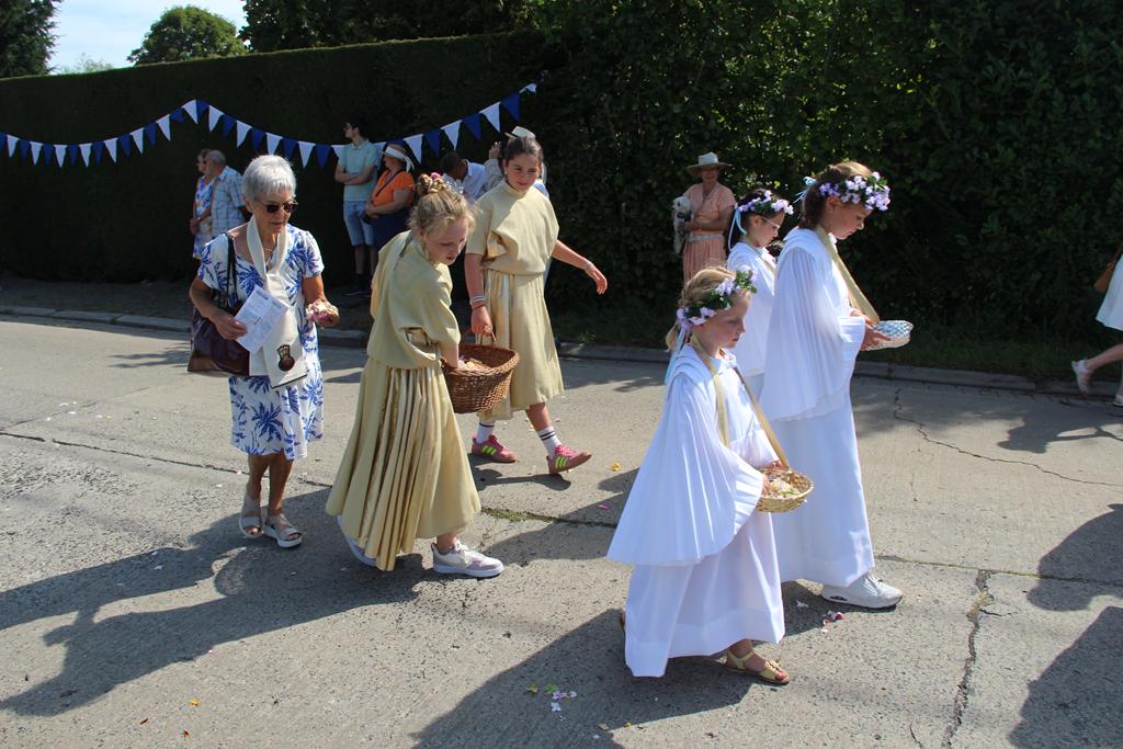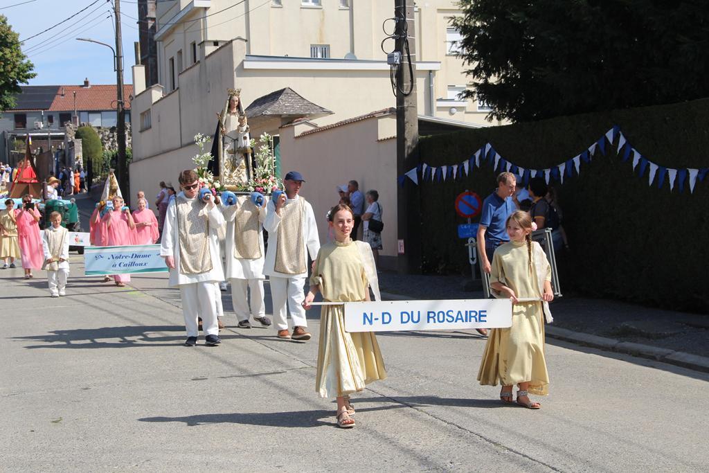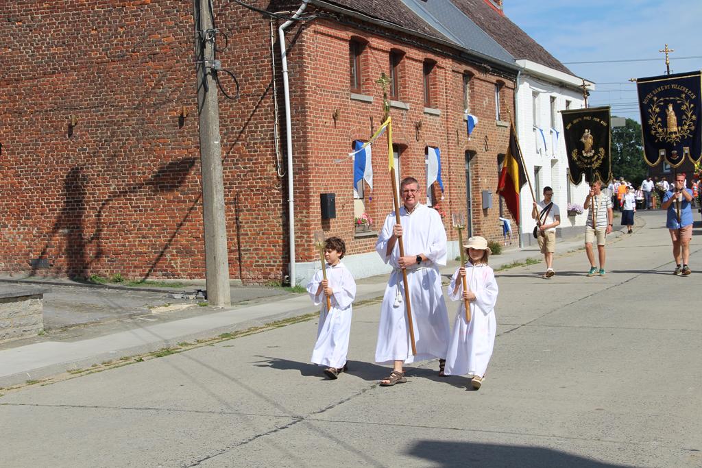 À la suite d’une Eucharistie festive, la procession se mit en route pour se rendre au Sanctuaire de Villers-Notre-Dame : les cavaliers, la croix de procession et les drapeaux, le char de remerciement pour les fruits de la terre et la Fanfare Royale les Amis réunis d’Ellezelles. Vinrent ensuite les statues qui attendaient avec impatience leur sortie annuelle : Saint-Amand, Notre-Dame du Rosaire et Notre-Dame à Cailloux.