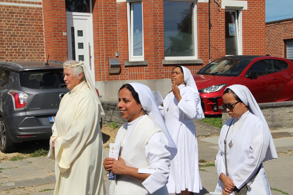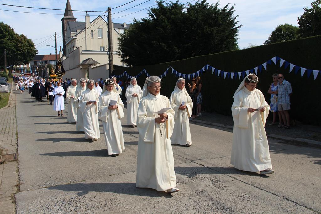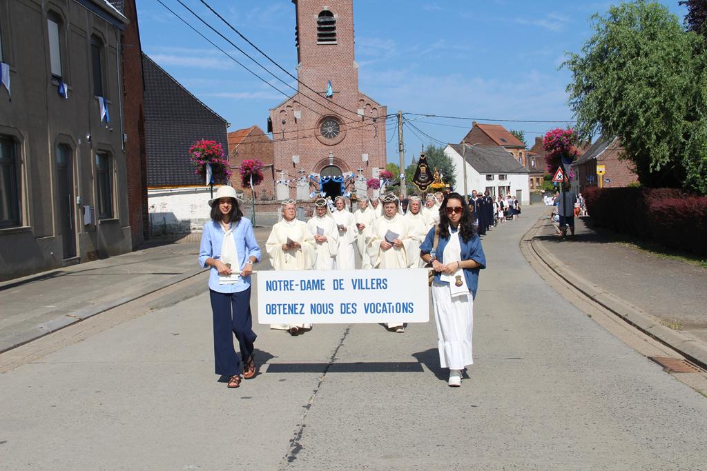 Vinrent ensuite les Consacrées de L’Œuvre et celles de Notre-Dame du Bon et Perpétuel Secours à Ellezelles, suivies de Notre-Dame de Villers entourée et portée par les Pèlerins de la Sedes Sapientiae : Dames, Messieurs, jeunes et enfants.