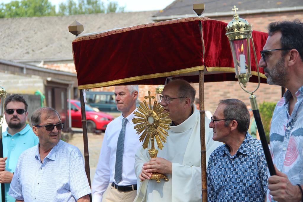 Jésus Eucharistie, précédé par les petites joncheuses qui jetèrent leurs pétales à profusion, et entouré par le clergé, les acolytes et les porte-flambeaux, traversa nos villages afin d’y étendre sa bénédiction en abondance. Les personnes à mobilité réduite, installées le long de la route, firent l’objet d’une bénédiction particulière.