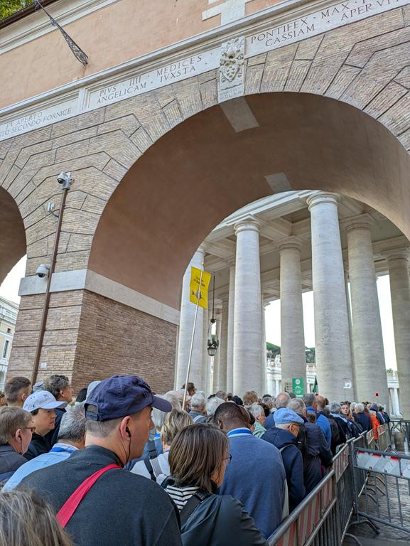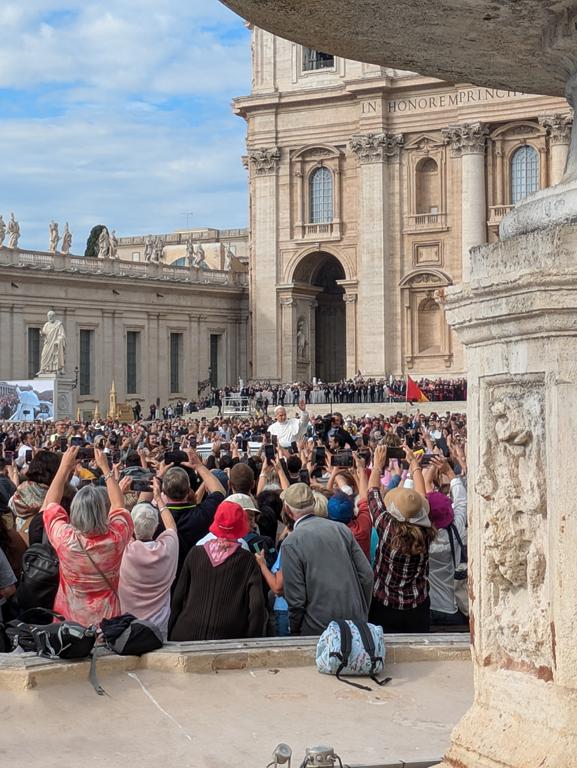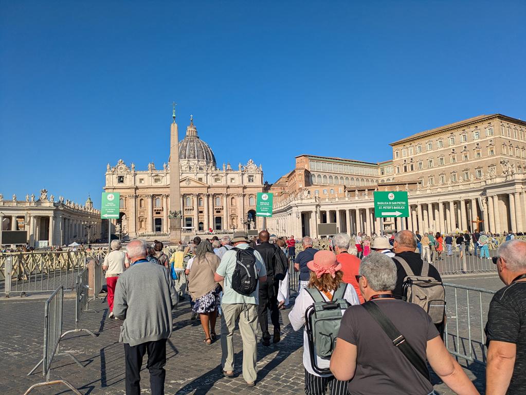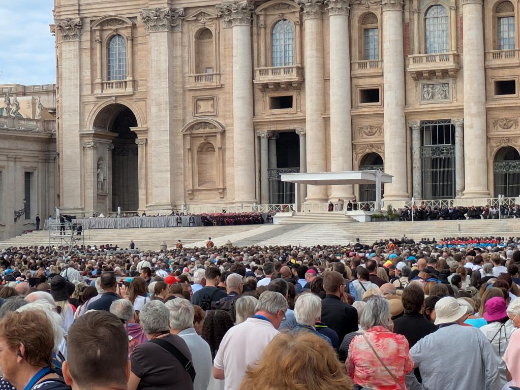 La file de pèlerins était longue ce matin pour arriver sur la place Saint-Pierre. Mais l’attente en valait la peine pour ce rendez-vous tant attendu : l’audience papale. Avec des milliers d’autres fidèles, nous avons reçu l’enseignement du pape Léon sur la résurrection – un beau moment de communion universelle.
