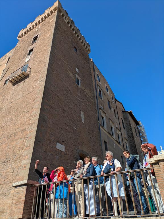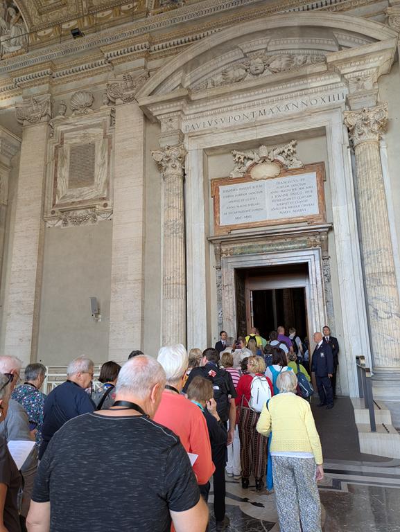 Après une bonne nuit de repos, nos pèlerins ont ouvert cette deuxième journée par le parcours jubilaire. Parti du Château Saint-Ange, l’itinéraire nous a conduits le long de la Via della Conciliazione jusqu’à la place Saint-Pierre, pour s’achever par le franchissement de la Porte Sainte. Sous la conduite de nos trois prêtres accompagnateurs – Olivier Fröhlich, Jean-Pierre Lorette et Simon Naveau – nous avons pu découvrir l’immensité et la splendeur de la basilique Saint-Pierre.