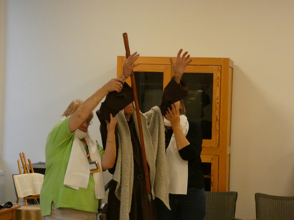 Première activité du week-end : jouer une petite saynète de l’Exode (Ex 17, 8-15), déguisements compris ! … C’est l’histoire bien connue impliquant Moïse et les Amalécites : Quand l’ennemi attaquait, Moïse priait Dieu sur la montagne ; voyant cela, son peuple était alors galvanisé et repoussait les assaillants. Quand Moïse était fatigué et baissait les bras, son peuple se décourageait et perdait du terrain. Heureusement les amis de Moïse l’ont alors aidé à tenir ses bras levés en signe de prière et cela, pendant de longues heures. Le peuple l’a vu, persévérant dans la prière, et a tenu bon dans la bataille. C’est tous ensemble, et grâce à la prière, qu’ils ont pu se sortir de ce mauvais pas.