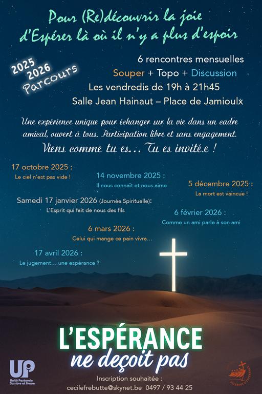 Après le succès du parcours Alpha, au cours duquel une cinquantaine de personnes de notre unité pastorale Sambre et Heure ont cheminé ensemble durant l’année pastorale 2024-2025, l’Équipe d’Animation Pastorale se réjouit de proposer un nouveau parcours intitulé « L’espérance ne déçoit pas ».