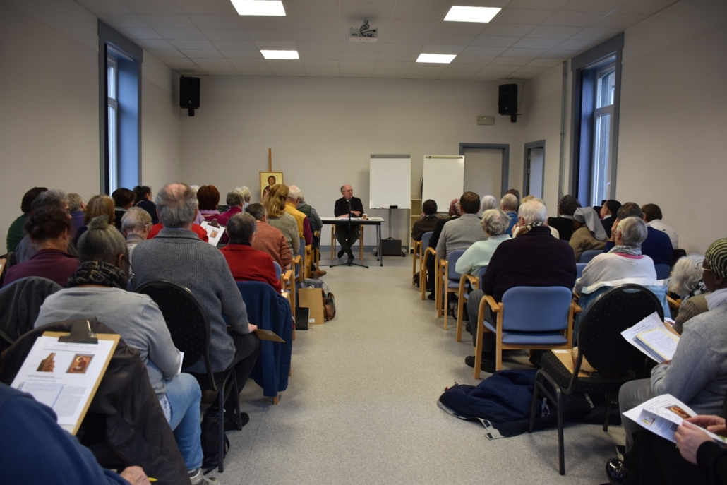 Le recteur de la Basilique a véritablement fait voyager l’assemblée lors de son intervention. Il a tenu à remettre Marie à sa juste place, tout en mettant en garde contre les dérives de sa dévotion. S’appuyant sur la note doctrinale Mater populi fidelis, publiée le 4 novembre dernier par le dicastère pour la Doctrine de la foi, il a rappelé que celle-ci conseille de ne pas utiliser certaines appellations pour qualifier la Vierge, comme les termes de co-rédemptrice ou de médiatrice. L’exhortation apostolique Marialis cultus de sa sainteté le Pape Paul VI a été une autre des références de l’abbé Lorette, citant ce document comme une source fiable pour comprendre comment mieux prier Marie.