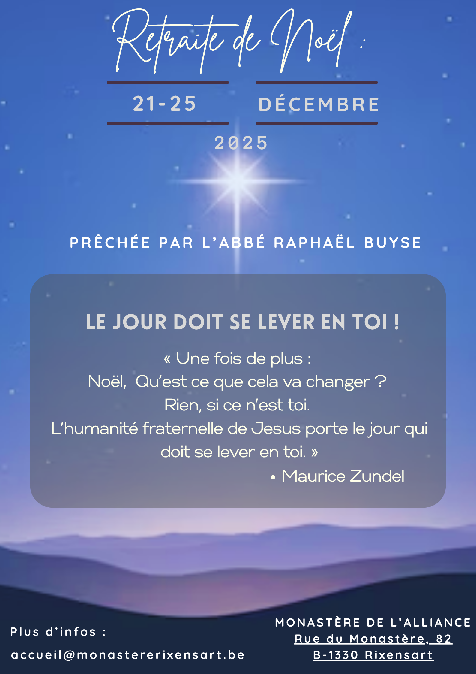 Le monastère de l’Alliance à Rixensart organise, avec l’abbé Raphaël Buyse, une retraite pour vivre le temps de noël du lundi 22 au jeudi 25 décembre.
