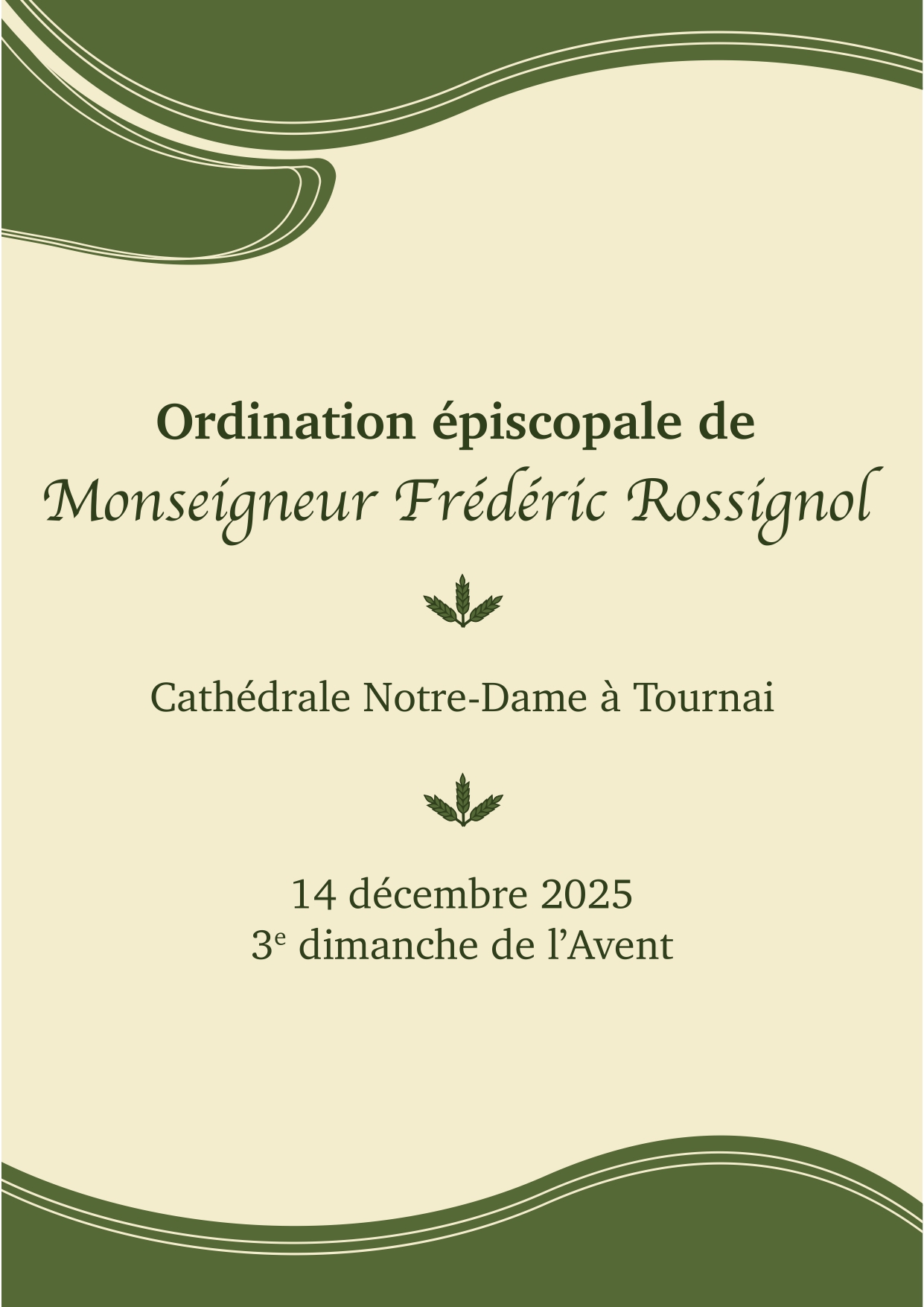 Ce dimanche 14 décembre 2025 à 15h, en la cathédrale Notre-Dame de Tournai, Mgr Frédéric Rossignol sera ordonné évêque par Mgr Luc Terlinden, archevêque de Malines-Bruxelles. Il succèdera ainsi à Mgr Guy Harpigny et deviendra le 101e évêque de Tournai.