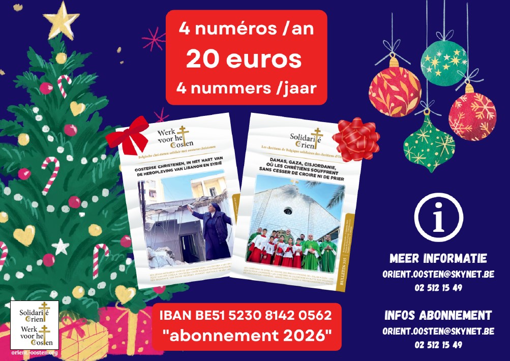 Un abonnement soit 4 numéros/an coûte 20 euros, somme qui ne nous laisse qu’une faible marge bénéficiaire, déduction faite des frais d’impression et d’envoi. Il suffit d’envoyer un mail à notre secrétariat (orient.oosten@skynet.be) avec nom, prénom, adresse postale et de verser la somme exacte sur le compte IBAN BE51 5230 8142 0562 avec en communication: «abonnement 2026». Il est égamement possible de souscrire à un abonnement solidaire en majorant vous-même le montant de l’abonnement. Nous vous demandons alors de le spécifier dans votre communication comme suit: