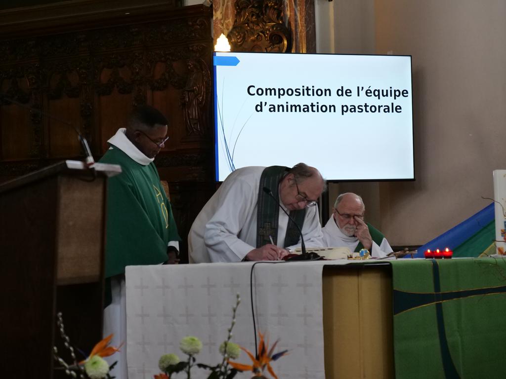 Le diocèse était représenté par Madame Brigitte Wautier et Monsieur Olivier Bénit, qui ont accompagné les équipes dans le processus de renouvellement et qui les ont aidées à concrétiser les nombreuses propositions présentées au cours de l’Assemblée paroissiale. L’Équipe d’animation pastorale est appelée à continuer le travail accompli conformément au Carnet de Route approuvé en 2017. Celui-ci invitait à développer quatre axes : « accueil et annonce », le développement du « Centre pastoral Maison Bon Berger », « jeunesse et famille » et « habiter nos églises ». Une feuille de route, signée par notre évêque et notre curé, invite à mettre l’accent sur la communication – tant entre nous que vis-à-vis de la société – l’accueil et l’accompagnement des demandes de sacrement – avec une attention particulière à l’accompagnement après les sacrements – et la création de liens au sein de l’Unité pastorale ».