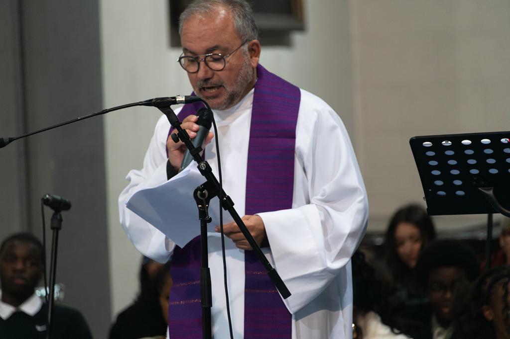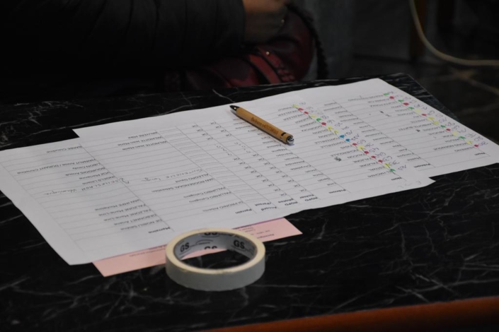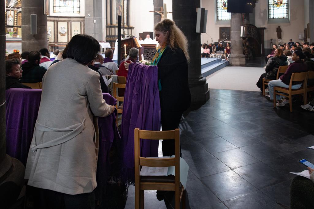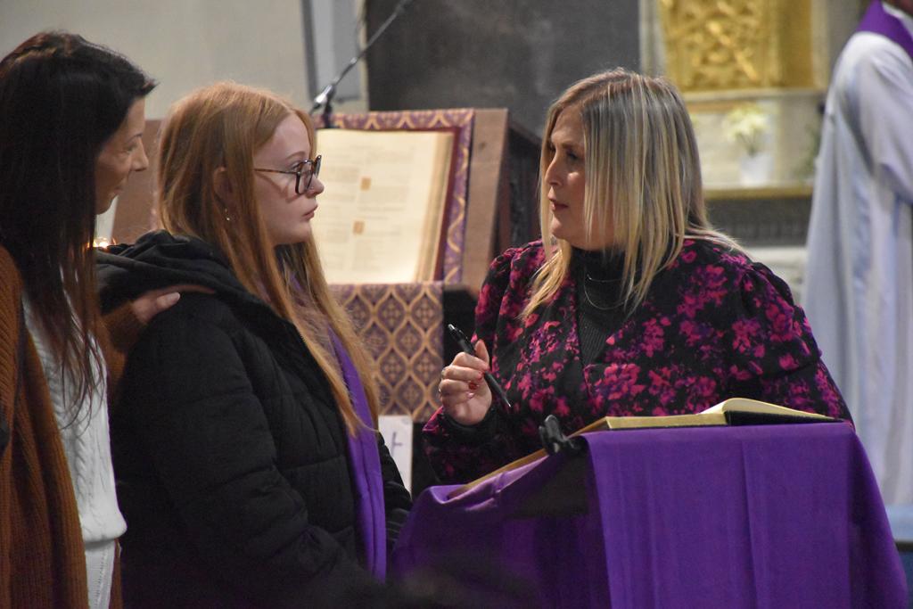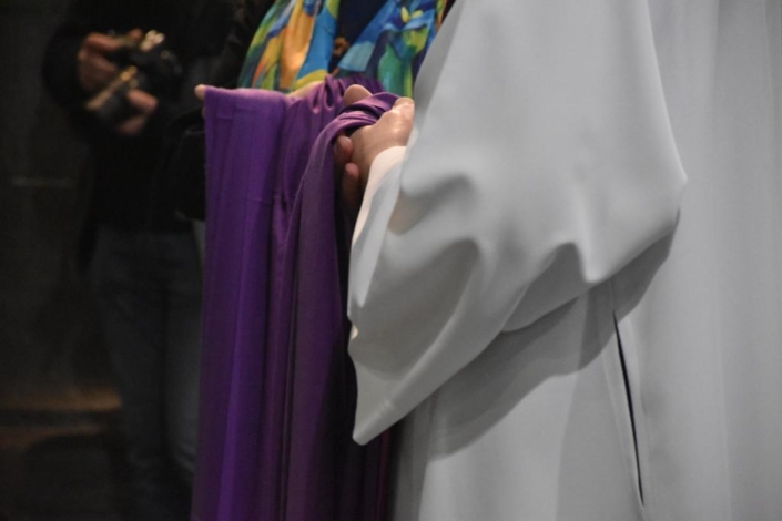Pendant la célébration, l’équipe a également eu beaucoup de tâches à coordonner. Derrière l’autel, quelques personnes étaient chargées de diriger les catéchumènes pour qu’ils se placent en rangées tandis que d’autres préparaient les écharpes violettes afin qu’elles soient prêtes pour ceux qui les remettraient aux catéchumènes. Il a fallu aussi apporter au bon moment les lutrins et les registres et coordonner l’inscription du nom pour éviter les embouteillages ou les éventuelles erreurs. Heureusement, une capsule vidéo avait été diffusée pour aider les catéchumènes et leurs accompagnateurs à se préparer à la célébration.