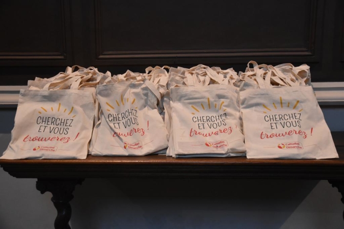 Pour que tout soit prêt avant l’arrivée des catéchumènes, l’équipe était présente sur place dès 11h. Petit imprévu à Mons : elle a dû attendre la fin de la messe dominicale et avait donc une heure de moins pour la mise en place. De nombreuses tâches doivent être effectuées, comme mettre les étiquettes sur les chaises pour les catéchumènes et leurs parrains/marraines, installer les tables d’accueil, préparer les écharpes, les registres, les enveloppes contenant les signets de prière et les consignes pour les scrutins à remettre aux UP, les cadeaux offerts par Cathobel…