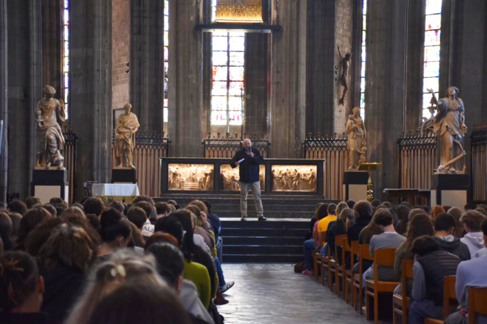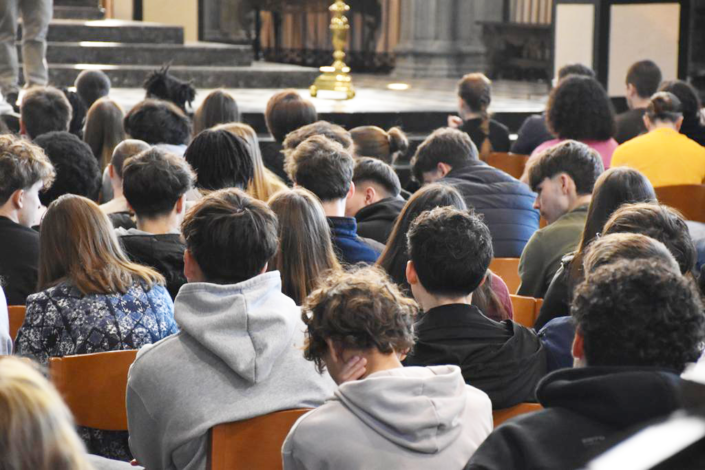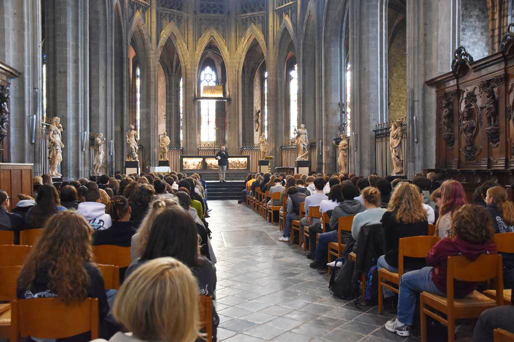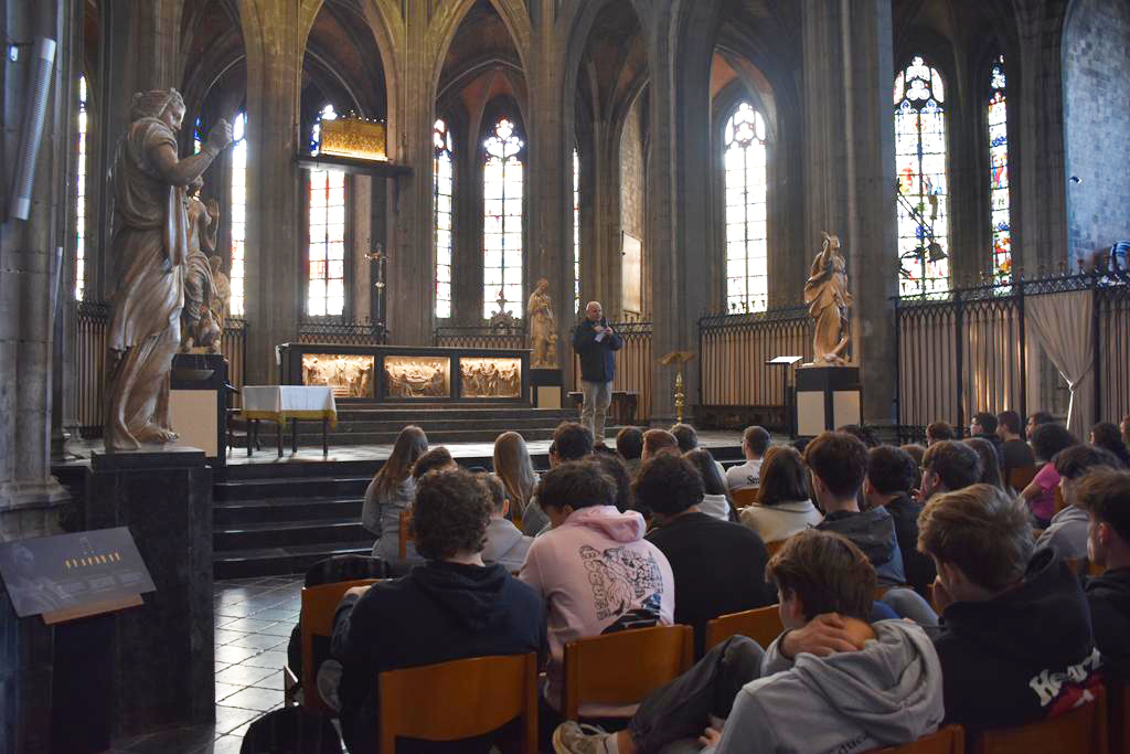 Ce jeudi 5 mars 2026, toutes les classes de rhétorique de l’Institut de la Sainte-Famille (ISF) et de l’Institut technique des Ursulines (ITU) étaient rassemblées dans la Collégiale Sainte-Waudru afin d’écouter et d’échanger avec Mgr Rossignol.