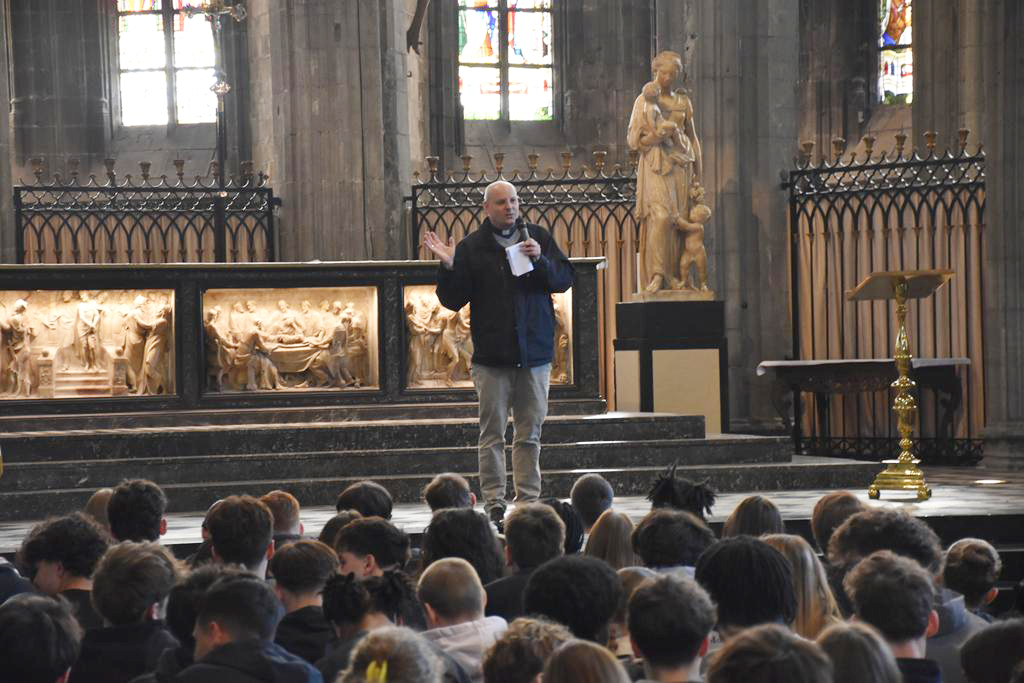 Un temps d’échange était ensuite proposé aux élèves, un moment privilégié pour en apprendre plus sur l’évêque. « Pourquoi avez-vous choisi ce métier ? » pose innocemment un membre de l’assemblée. Mgr Rossignol y répond avec honnêteté : « J’ai rencontré beaucoup de personnes dans ma vie qui m’ont permis de connaître l’amour de Dieu. » Conscient également de la crise des vocations et du risque d’avoir par la suite moins de célébration par manque de prêtres, il a aussi répondu au besoin de la société en plus d’un appel personnel.