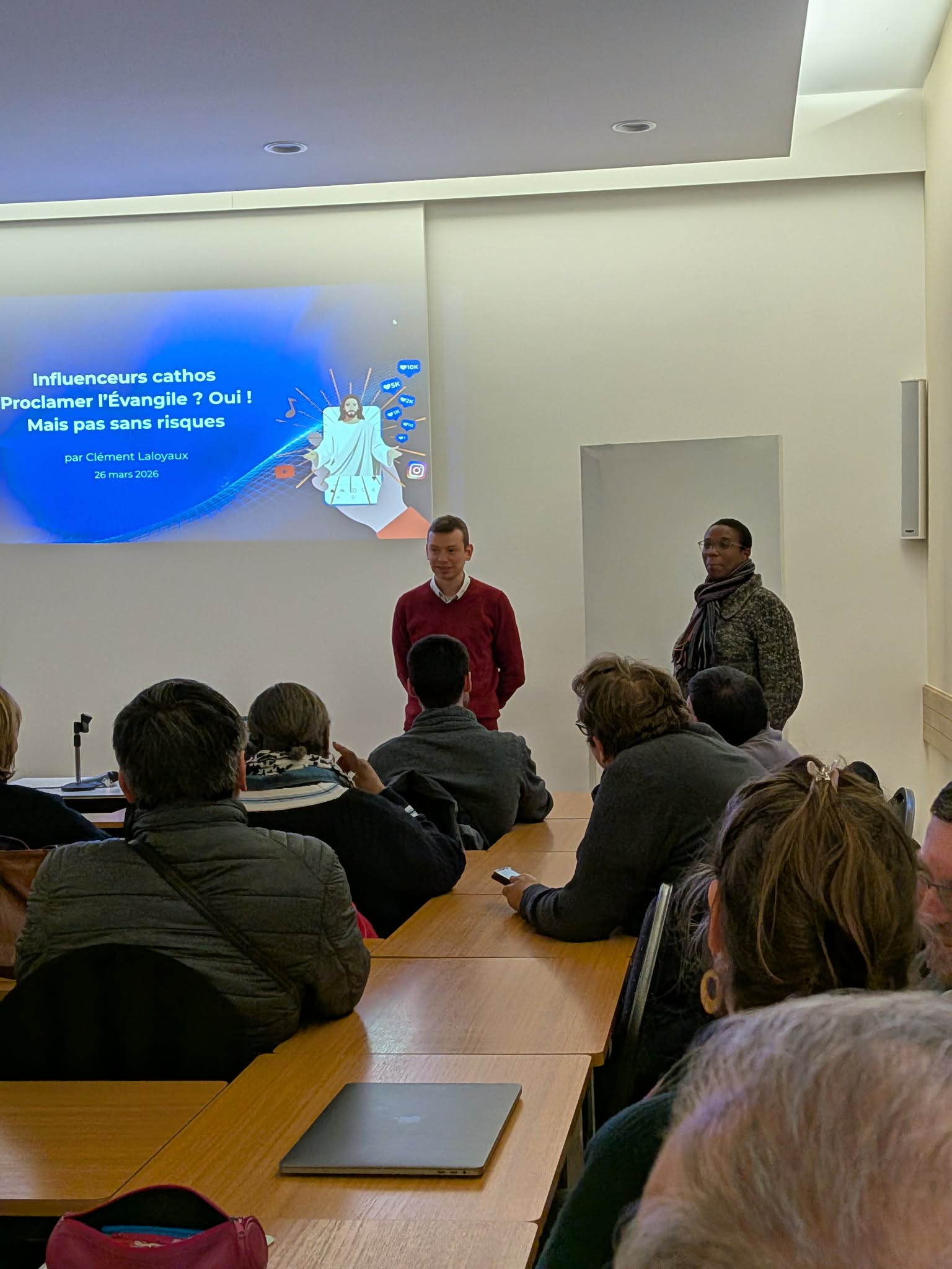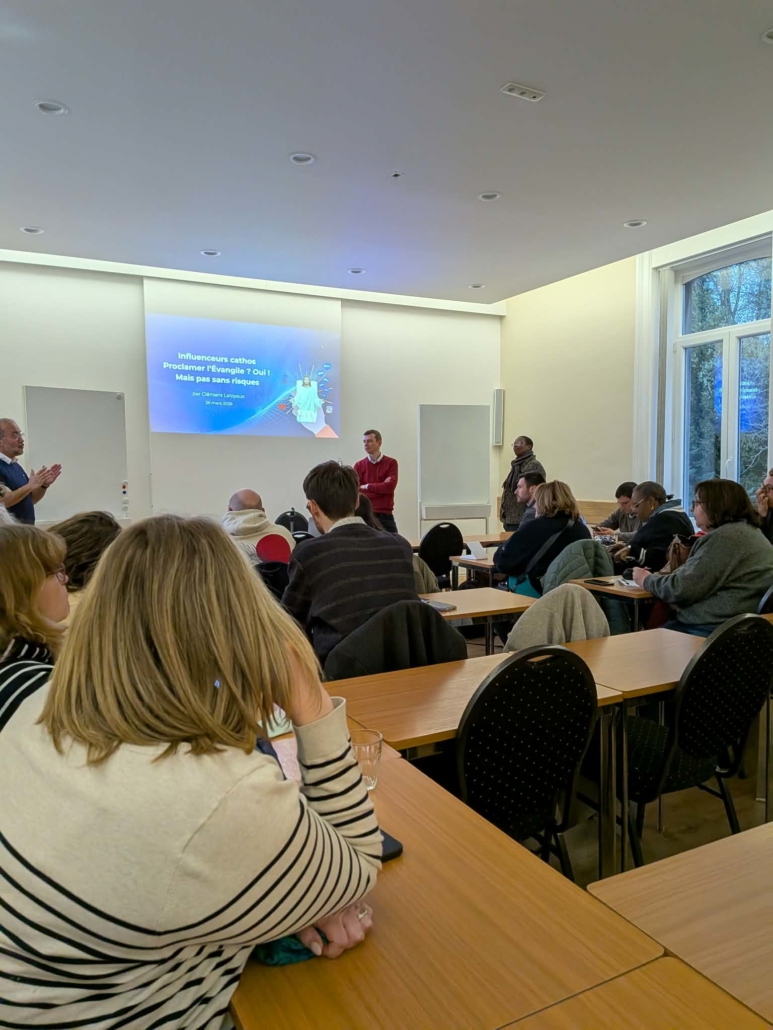 Les participants ont ensuite eu la chance d’écouter Clément Laloyaux, journaliste à Cathobel, qui, fort de son enquête menée auprès de plusieurs influenceurs catholiques, a offert un éclairage riche et nuancé sur ce phénomène en pleine expansion. Il a dressé un panorama du monde des influenceurs cathos aujourd’hui, mettant en lumière à la fois les beaux fruits qu’ils portent — témoignages vivants, créativité missionnaire, proximité avec les jeunes — mais aussi les risques bien réels liés à l’exposition, à la recherche de visibilité ou encore aux dérives possibles.