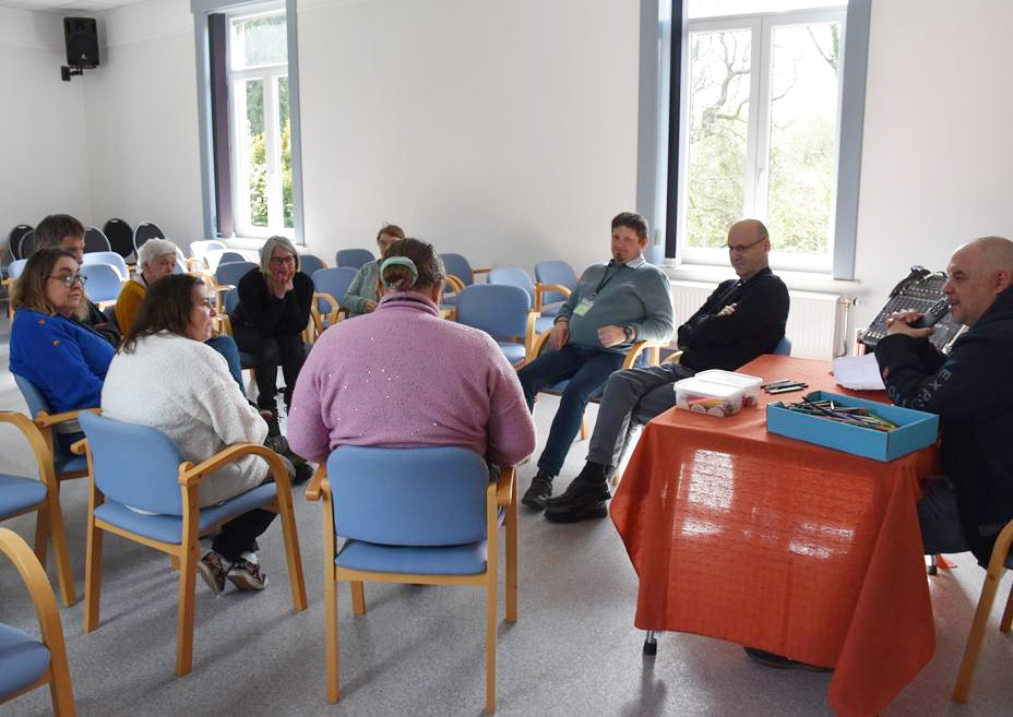Une fois rassemblés dans la grande salle du rez-de-chaussée, les participants écoutent attentivement Élisabeth, qui présente la journée et celles et ceux qui l’animeront. «Aujourd’hui, on va essayer de voir ce que veut dire ‘se rencontrer’.» Une chanson aux paroles évocatrices est lancée: la route est courte, ce serait dommage de se croiser sans se regarder, sans se rencontrer…