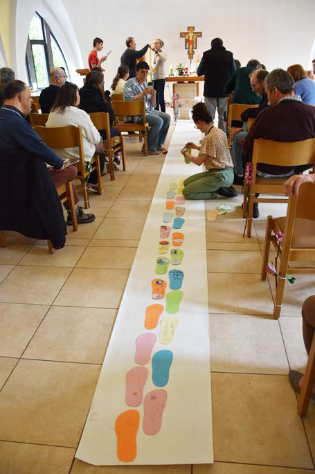 Dans la chapelle magnifiquement décorée, tout le monde se retrouve pour un dernier moment de partage. Un «Notre Père» pendant lequel une grande chaîne de mains se forme. Puis, sur une longue bande de papier déroulée dans l’allée centrale, un à un, les «pas» décorés et pleins de petits mots sont collés et tracent un chemin. Un chemin de joie et de rencontre.