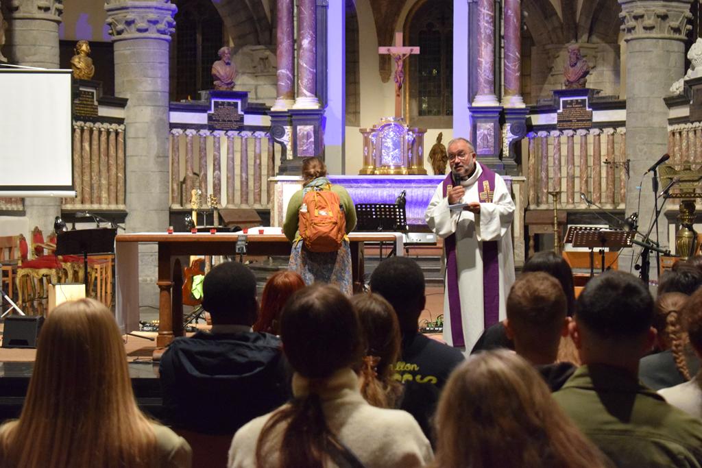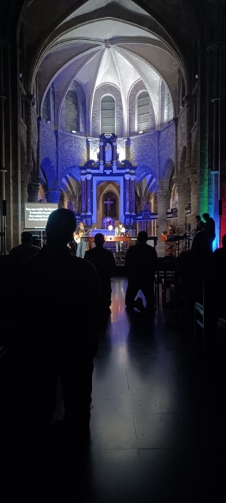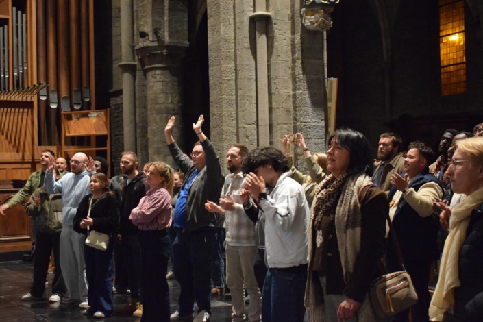 L’église Saint-Quentin a accueilli les participants pour clôturer la soirée. Un moment de louange était animé par le groupe Rise Up, attirant même des curieux venus découvrir ce qu’il se passait à l’intérieur.  Ce fut un moment fort de joie, de prière, de chants et de danse, qui fit naître sur les visages de chacun de nombreux sourires, reflet de ce qui se vivait à l’intérieur d’eux. On se met en mouvement pas seulement par la parole mais également par les gestes, exemple inspirant de ce qu’ils sont amenés à être dans le monde d’aujourd’hui. Avant même les premières notes, toutes les personnes assises sagement sur les bancs de l’église sont invitées à avancer et à ne former plus qu’une seule communauté louant le Seigneur à l’unisson.