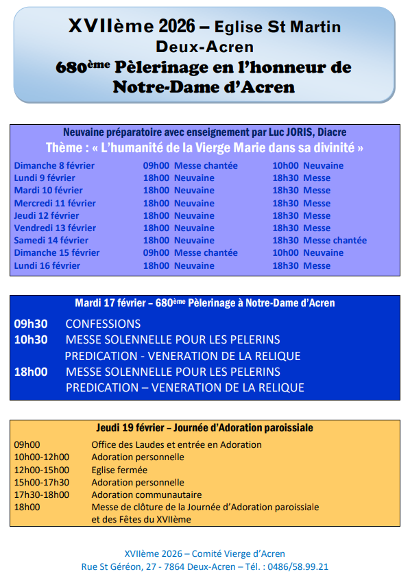 Le Comité Vierge d’Acren vous invite à la traditionnelle Neuvaine préparatoire à la fête du XVIIe qui se déroulera en l’église St-Martin de Deux-Acren du dimanche 8 février au lundi 16 février inclus.