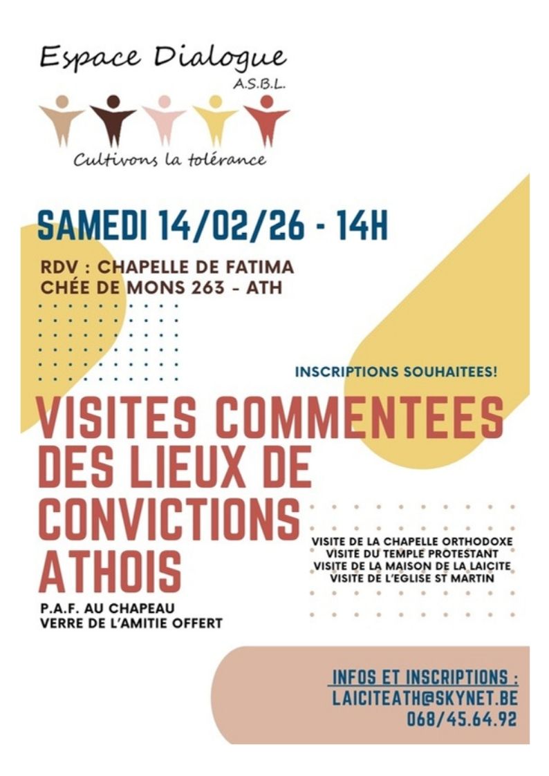 L’association «Espace Dialogue» de Ath propose le samedi 14 février 2026 une animation proposant de découvrir les lieux convictionnels athois:  la chapelle orthodoxe, le Temple protestant, l’église catholique Saint-Martin et la Maison de la Laïcité du Pays d’Ath.