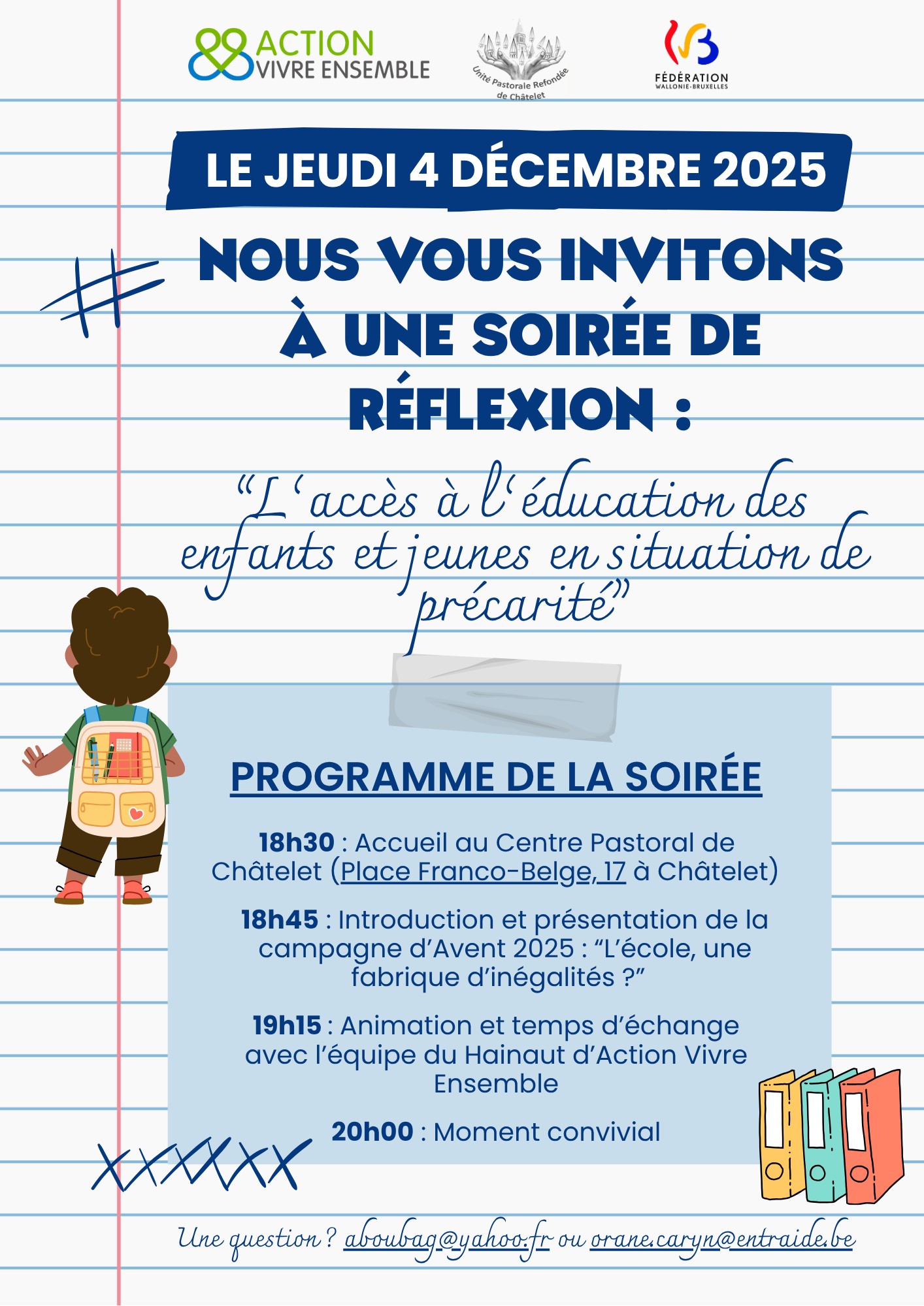 L’équipe d’Action Vivre Ensemble de Charleroi et l’Unité Pastorale de Châtelet vous invitent pour une soirée d’échanges dans le cadre de la campagne d’Avent 2025 « L’école, fabrique d’inégalités ? ».