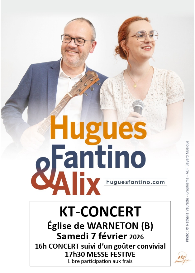 À l’invitation des catéchistes de Comines-Warneton, le chanteur en Église Hugues Fantino et sa fille Alix proposeront un concert ouvert à tous, avec des chants exprimant la joie de la Foi, le samedi 7 février à 16h en l’église de Warneton (B) suivi d’un petit goûter convivial et de la messe festive à 17h30.