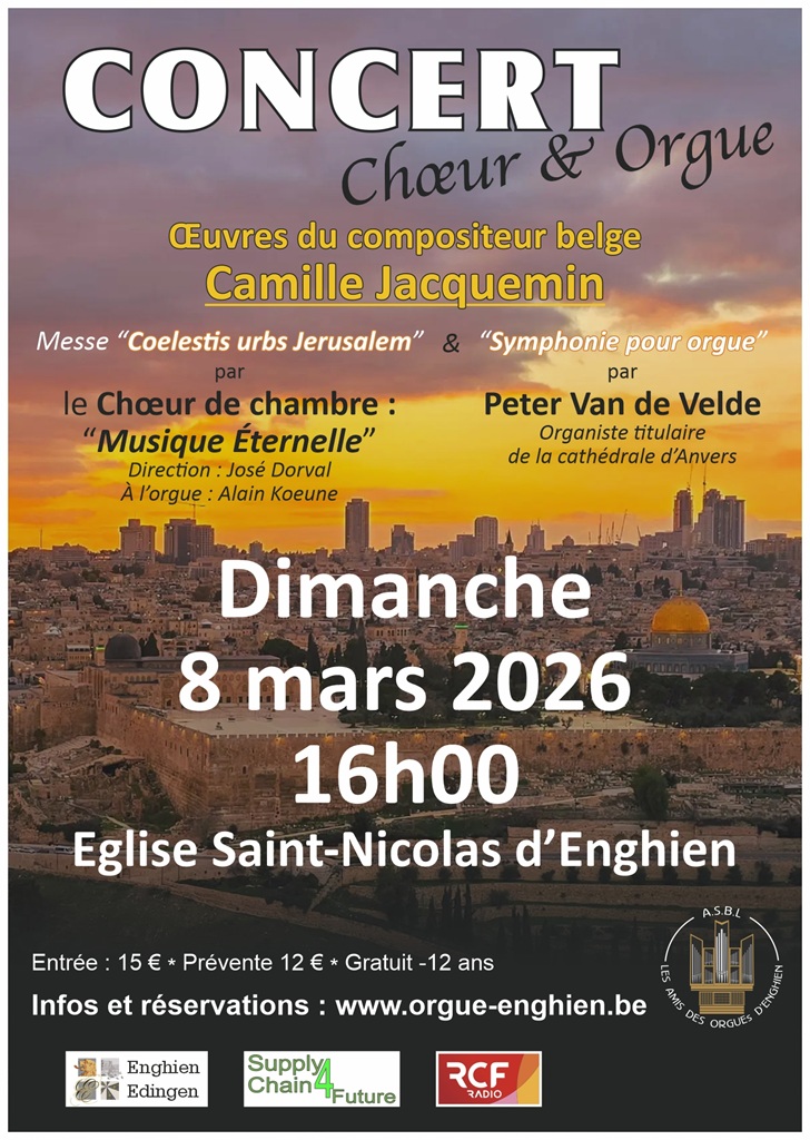 Enghien : concert « Chœur et orgue » + Ajouter à mon Agenda Google + iCal / Outlook export Date 08 Mar 2026 Heure 16 h 00 min Lieu Église Saint-Nicolas d'Enghien Enghien Catégorie Concert Partagez cet événement