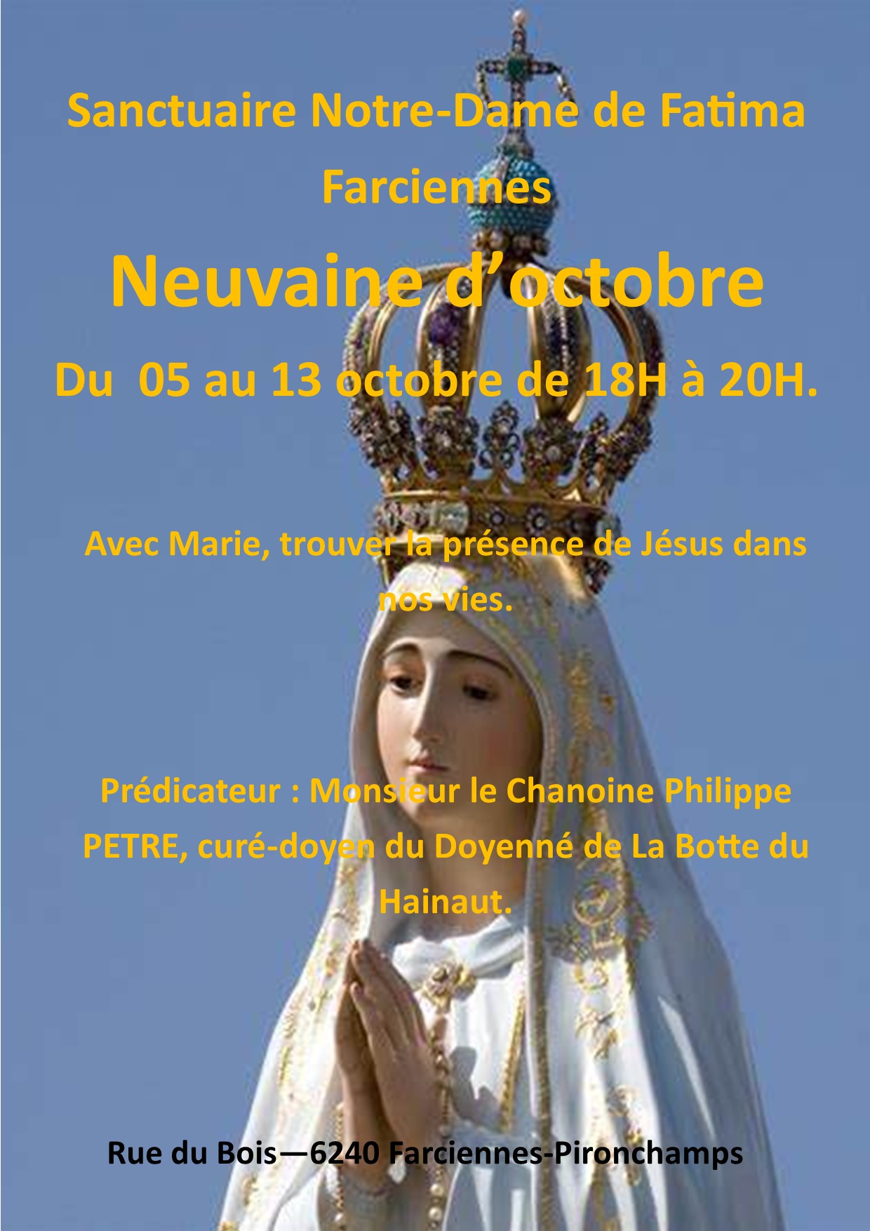 Farciennes : neuvaine à Notre-Dame de Fatima + Ajouter à mon Agenda Google + iCal / Outlook export Date 05 Oct 2025 Heure 18 h 00 min - 20 h 00 min Lieu Sanctuaire Notre-Dame de Fatima (Farciennes) UP Notre-Dame de Fatima Catégorie Neuvaine Partagez cet événement
