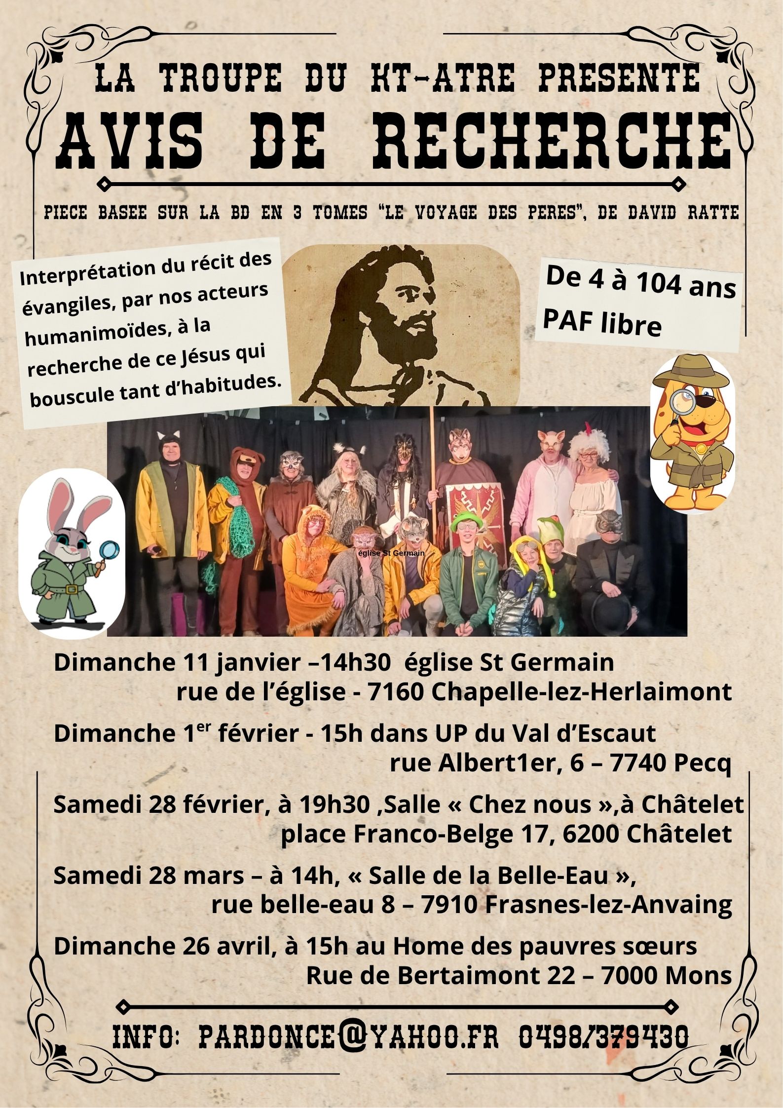 La troupe du KT-âtre de Gerpinnes à mis au point un nouveau spectacle : « Avis de recherche ». Cette pièce, inspirée de la bande dessinée  » Le voyage des peres » à déjà été mise en scène il y a 8 ans par la troupe de Frasnes. Cependant, la mise en scène a fortement changé. Les personnages ont les traits d’animaux, faisant ressortir d’avantage leur caractère.