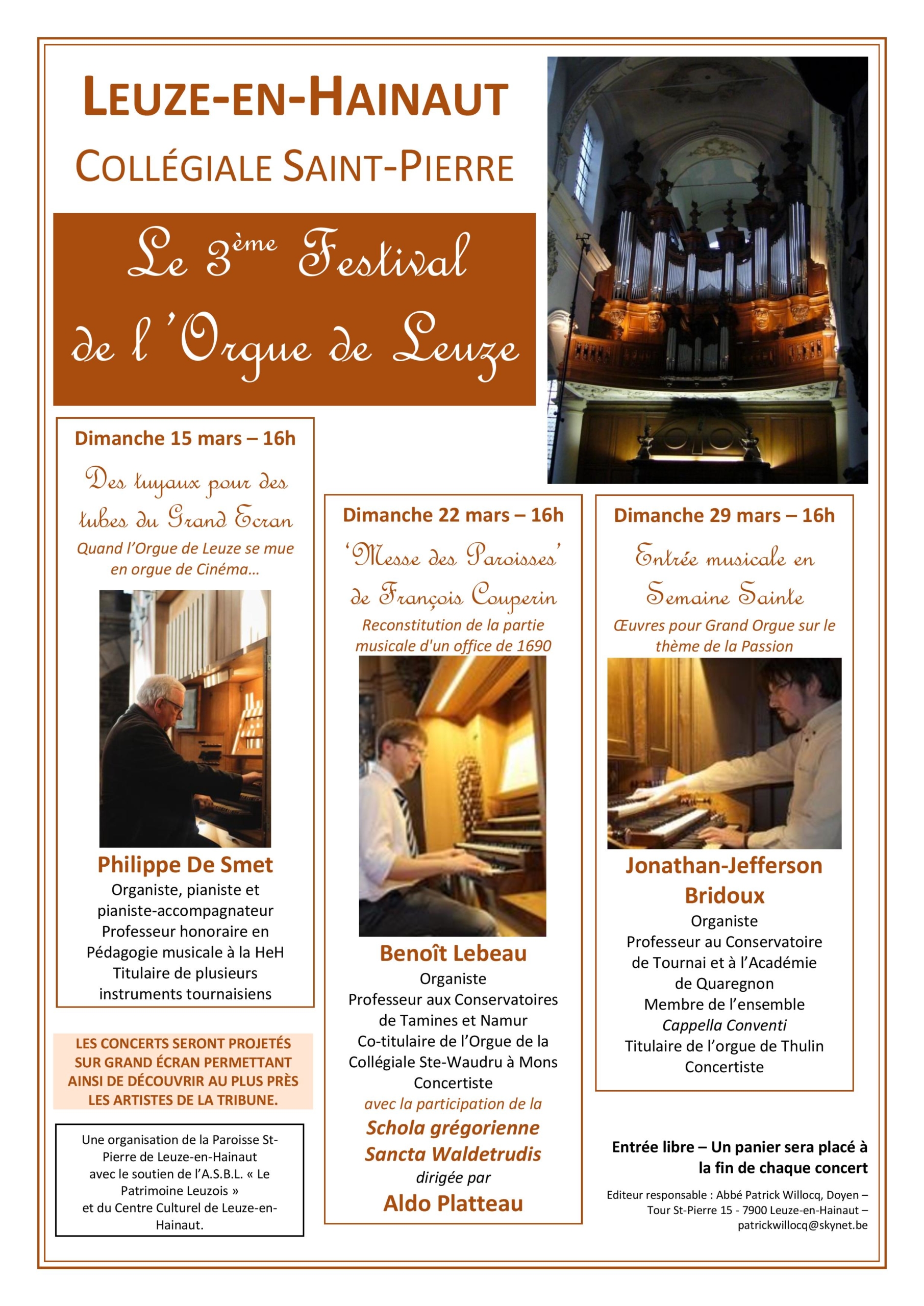 Le Festival se poursuivra le 22 mars (16h) avec l’un des deux co-titulaires du grand instrument de la Collégiale Ste-Waudru à Mons : M. Benoît Lebeau (organiste, enseignant) qui reprendra l’une des pièces maîtresses du grand répertoire français : la « Messe à l’usage des Paroisses » (1690) de François Couperin (1668-1733), une œuvre taillée sur mesure pour l’instrument de Leuze. B. Lebeau sera accompagné pour l’occasion par la Schola grégorienne Sancta Waldetrudis sous la direction d’Aldo Plateau.