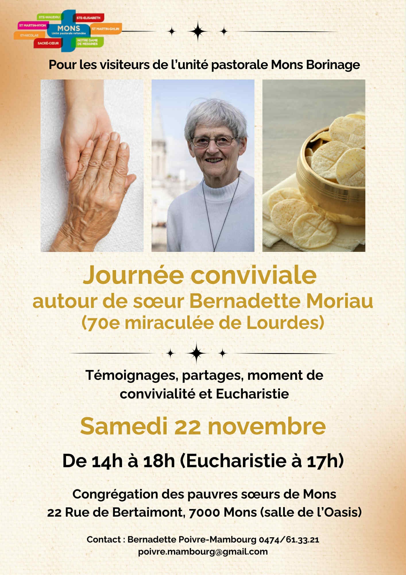 Mons : rencontre avec Soeur Bernadette Moriau, miraculée de Lourdes + Ajouter à mon Agenda Google + iCal / Outlook export Date 22 Nov 2025 Heure 14 h 00 min - 18 h 00 min Lieu Salle "L'Oasis" (Mons) UP de Mons Catégorie Rencontre Partagez cet événement