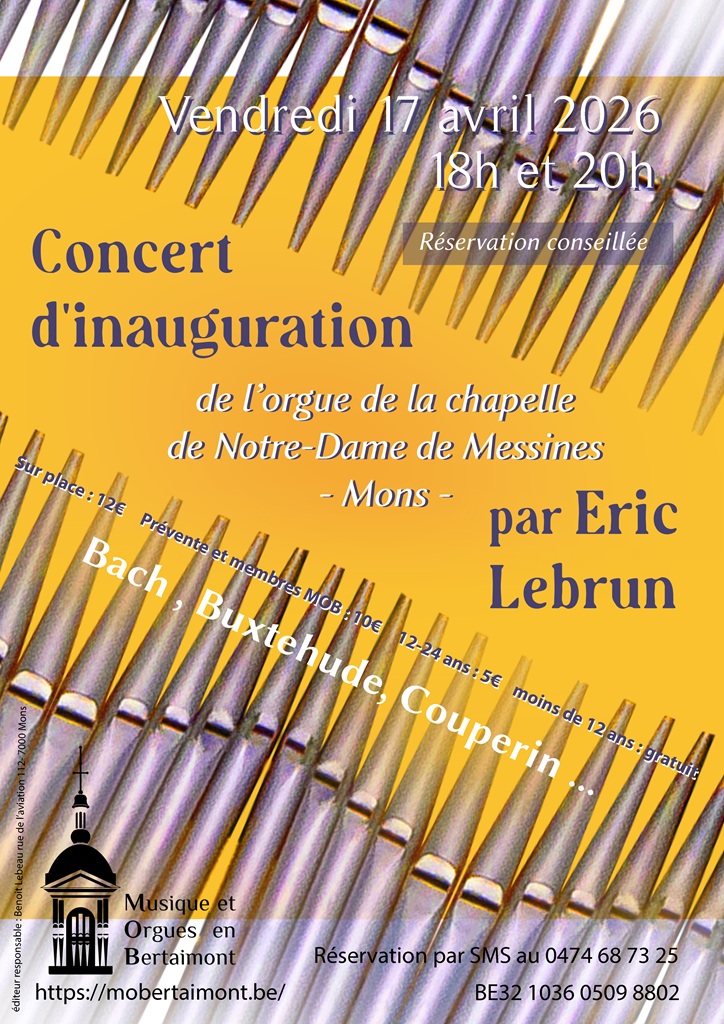 ND de Messines : inauguration de l’orgue + Ajouter à mon Agenda Google + iCal / Outlook export Date 17 Avr 2026 Heure 18 h 00 min Lieu Église Notre-Dame de Messines UP de Mons Catégorie Concert Partagez cet événement