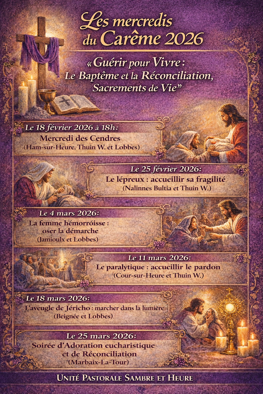 Sambre et Heure : mercredis de Carême + Ajouter à mon Agenda Google + iCal / Outlook export Date 25 Fév 2026 Heure 18 h 00 min - 20 h 00 min Lieu UP Sambre et Heure Organisateur UP Sambre-et-Heure Site Web https://www.upsh.info/ Partagez cet événement