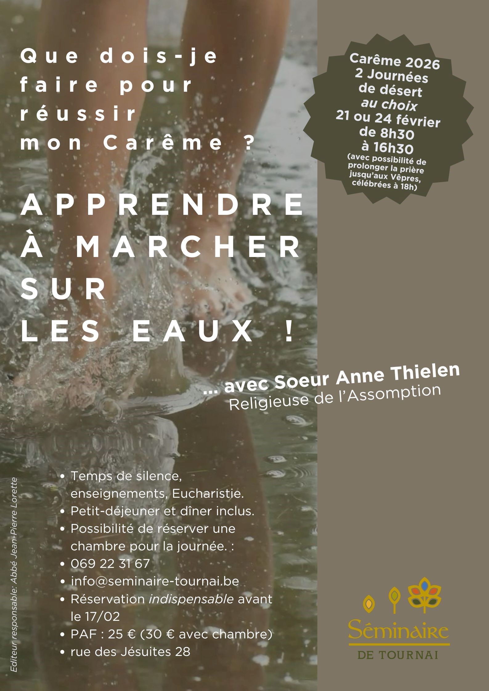 Samedi 21 ou mardi 24 février, de 8h30 à 16h30, avec possibilité de prolonger la prière jusqu’aux Vêpres (célébrées à 18h). Temps d’enseignements, de silence, eucharistie. Petit-déjeuner et dîner inclus. Possibilité de réserver une chambre pour la journée. PAF : 25 € (30 € avec chambre). Réservation indispensable avant le 17 janvier à info@seminaire-tournai.be ou au +32 69 22 31 67.
