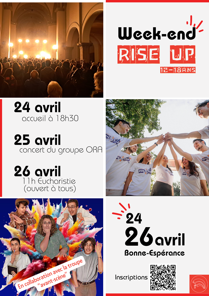 Le weekend Rise Up!, c’est un moment pour te ressourcer, rencontrer d’autres jeunes chrétiens de ton âge (12-18 ans), et continuer à fêter Pâques!